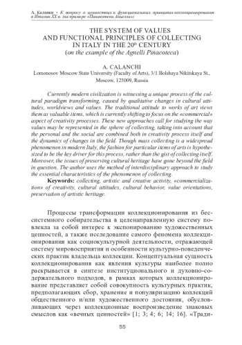 Современная практика коллекционирования переживает уникальный процесс трансформации культурной парадигмы, которая вызвана качественными изменениями культурных установок, мировоззренческих смыслов и ценностных ориентаций. В системе традиционных характеристик значимости произведений искусства формируются новые подходы, ориентированные на «коммерциализацию» творческого начала, что обусловливает необходимость исследования ценностных смыслов феномена коллекционирования, в рамках которого синтезируется личное и социальное начало художественно-творческой деятельности в динамике их изменений. В современной Италии приходится констатировать повсеместное распространение типа массового коллекционирования, которое предлагается понимать как ориентирование не столько на содержательный характер собирательства, сколько на моду на те или иные «шедевры» и «ценности». При этом вопросы сохранения художественного наследия перестали находиться в фокусе культурного поведения. Автор опирается на метод междисциплинарных подходов в изучении сущностных характеристик самого феномена коллекционирования.