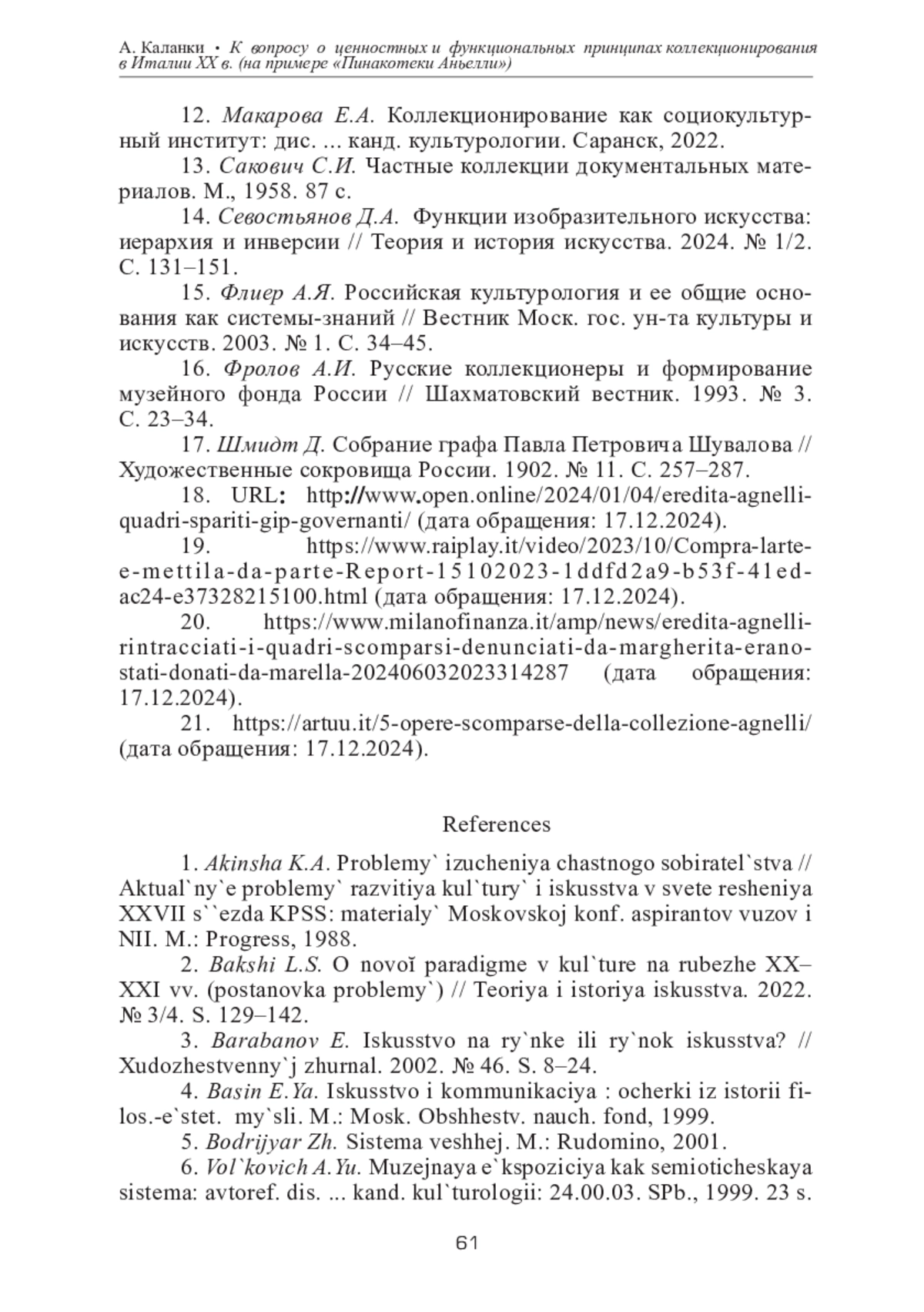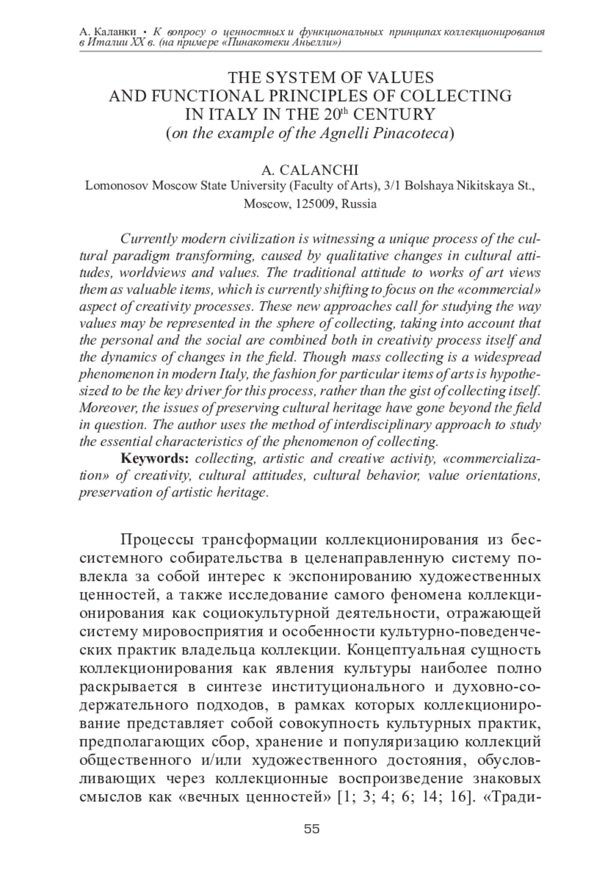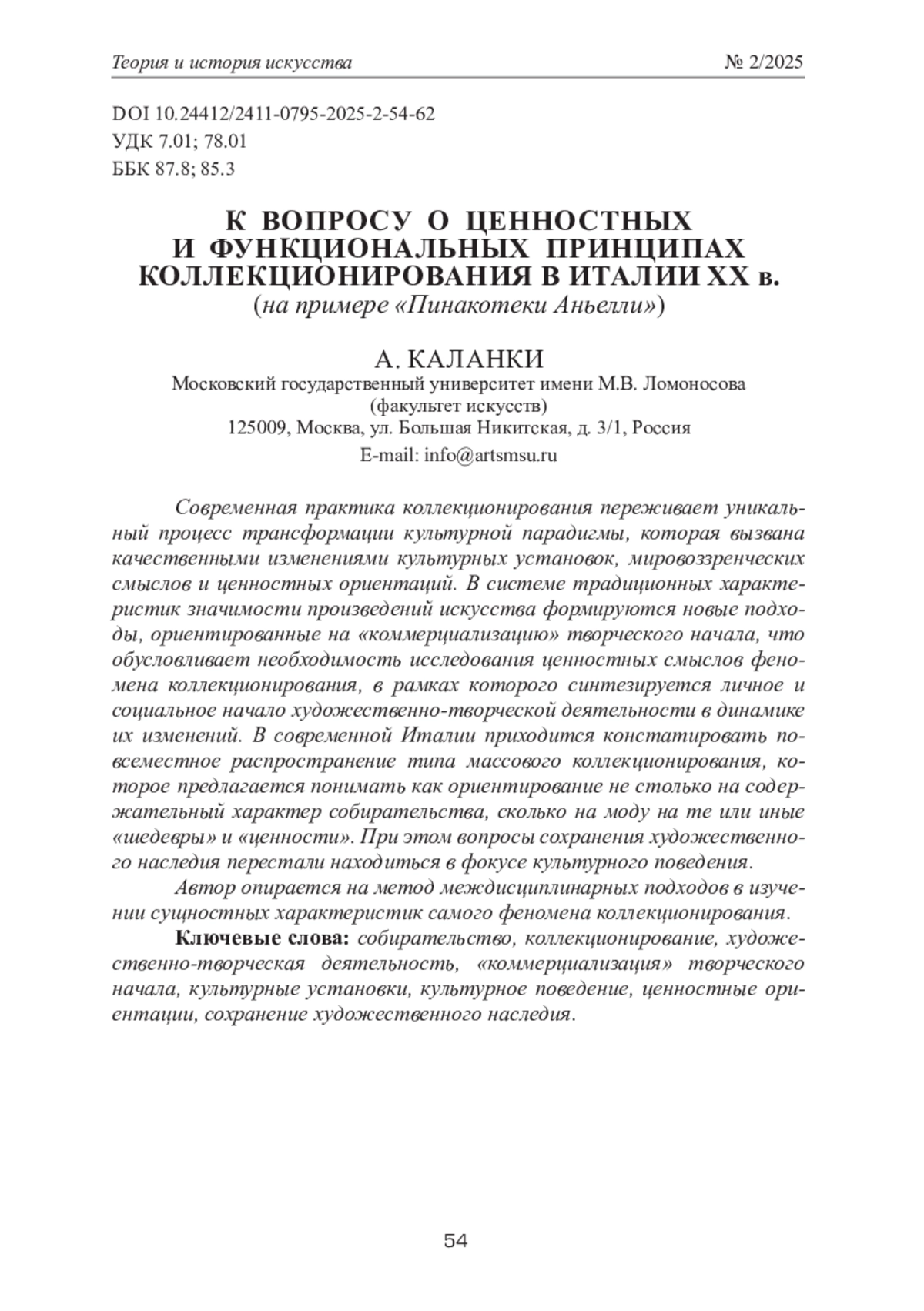 КАЛАНКИ А. К ВОПРОСУ О ЦЕННОСТНЫХ И ФУНКЦИОНАЛЬНЫХ ПРИНЦИПАХ КОЛЛЕКЦИОНИРОВАНИЯ В ИТАЛИИ ХХ В. (НА ПРИМЕРЕ «ПИНАКОТЕКИ АНЬЕЛЛИ») // ТЕОРИЯ И ИСТОРИЯ ИСКУССТВА. 2025. № 2