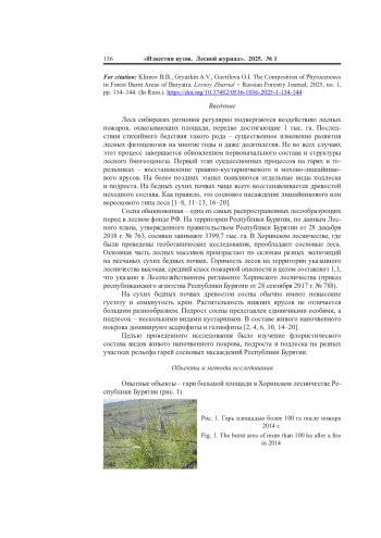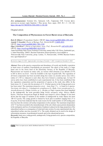 Представлены данные по видовому составу и обилию древесной и кустарниковой растительности на гарях южного Забайкалья. Объект исследования - гари большой площади в лесном фонде Хоринского лесничества Республики Бурятии. Фитоценозы расположены на песчаных почвах, на разных элементах рельефа на высоте от 676 до 845 м над ур. м. - от подножий до вершин пологих холмов. Учет растительности всех компонентов леса проводили по свободным маршрутным ходам на круговых учетных площадках радиусом 1,785 м. Примыкая друг к другу, они образовывали учетную ленту. На каждом опытном участке закладывали не менее 30 учетных площадок. Установлено, что состав растительности и долевое участие видов на объектах исследования различаются. На гарях 14-15-летней давности отмечено наличие 15-18 видов растений в составе живого напочвенного покрова. Максимальное проективное покрытие - более 5 % имеют 6 видов: Vaccinium vitis-idaea L., Calamagrostis arundinacea (L.) Roth, Carex pseudocyperus L., Avenella flexuosa (L.) Drejer, Lichenes sp. L., Bryidae sp. Engl. В составе подлеска выявлено 6 видов, преобладают Sorbus aucuparia subsp. Sibirica (Hedl.) Krylov, Viburnum burejaeticum Regel & Herder и Juniperus sibirica Burgsd. Показано, что размах варьирования численности подлеска по объектам исследования составил 190-673 экз./га. Подрост сформирован сосной обыкновенной в количестве от 27 до 62 экз./га. Указано, что основной причиной небольшой численности самосева сосны являлись экстремальные температуры поверхности почвы в летний период. Зафиксирована максимальная температура 63 °С на минерализованной части почвы, что вызывает денатурацию белка в эндосперме и потерю всхожести семян. Акцентируется внимание на большой доле минерализованной поверхности как следствия ветровой и водной эрозии. На отдельных опытных участках площадь минерализованной поверхности превысила 18 %. Полученные результаты могут быть использованы при проектировании лесовосстановительных мероприятий, при геоботанических исследованиях и в учебном процессе.