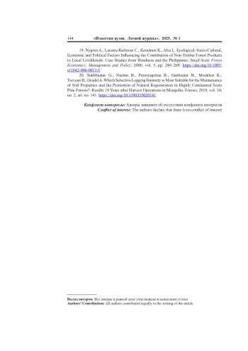 20. Sukhbaatar G., Nachin B., Purevragchaa B., Ganbaatar B., Mookhor K., Tseveen B., Gradel A. Which Selective Logging Intensity is Most Suitable for the Maintenance of Soil Properties and the Promotion of Natural Regeneration in Highly Continental Scots Pine Forests?-Results 19 Years after Harvest Operations in Mongolia. Forests, 2019, vol. 10, no. 2, art. no. 141. DOI: 10.3390/f10020141 EDN: XSGKZE