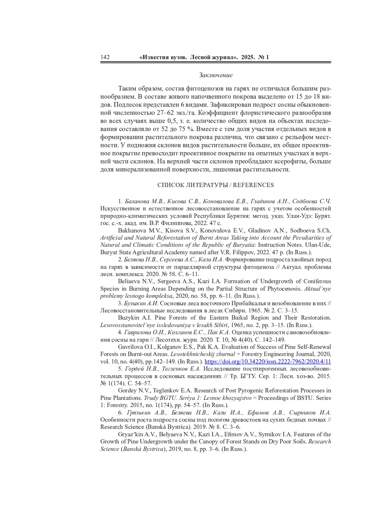 2. Беляева Н.В., Сергеева А.С., Кази И.А. Формирование подроста хвойных пород на гарях в зависимости от парцеллярной структуры фитоценоза // Актуал. проблемы лесн. комплекса. 2020. No 58. С. 6-11.