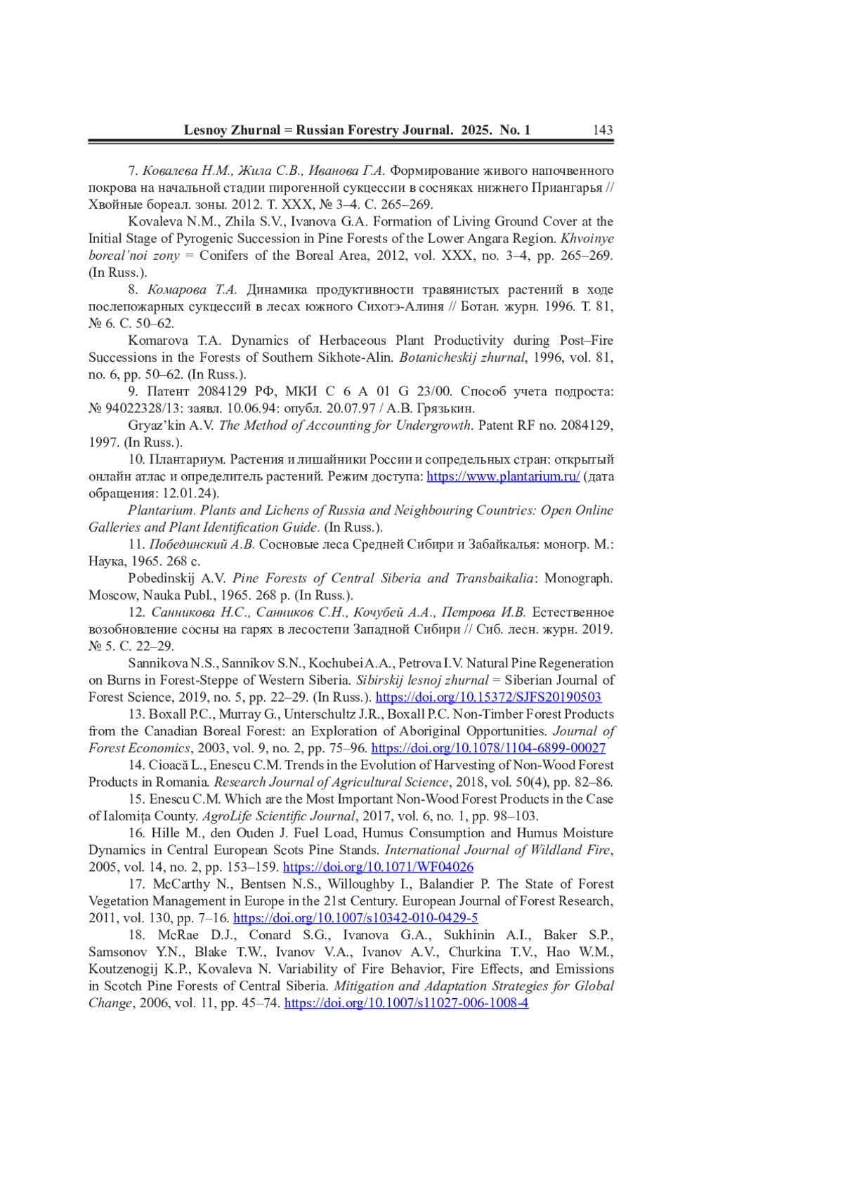 7. Ковалева Н.М., Жила С.В., Иванова Г.А. Формирование живого напочвенного покрова на начальной стадии пирогенной сукцессии в сосняках нижнего Приангарья // Хвойные бореал. зоны. 2012. Т. ХХХ, No 3-4. С. 265-269.