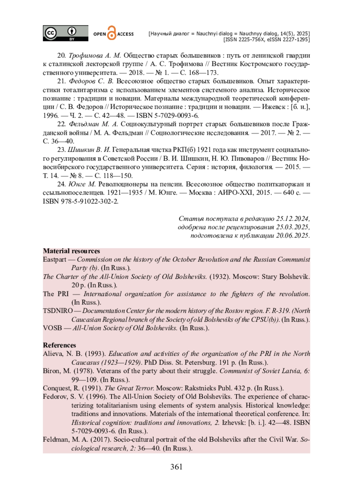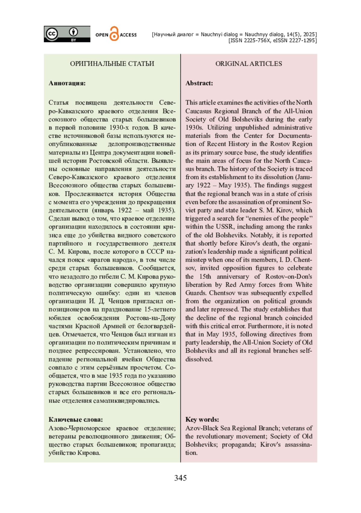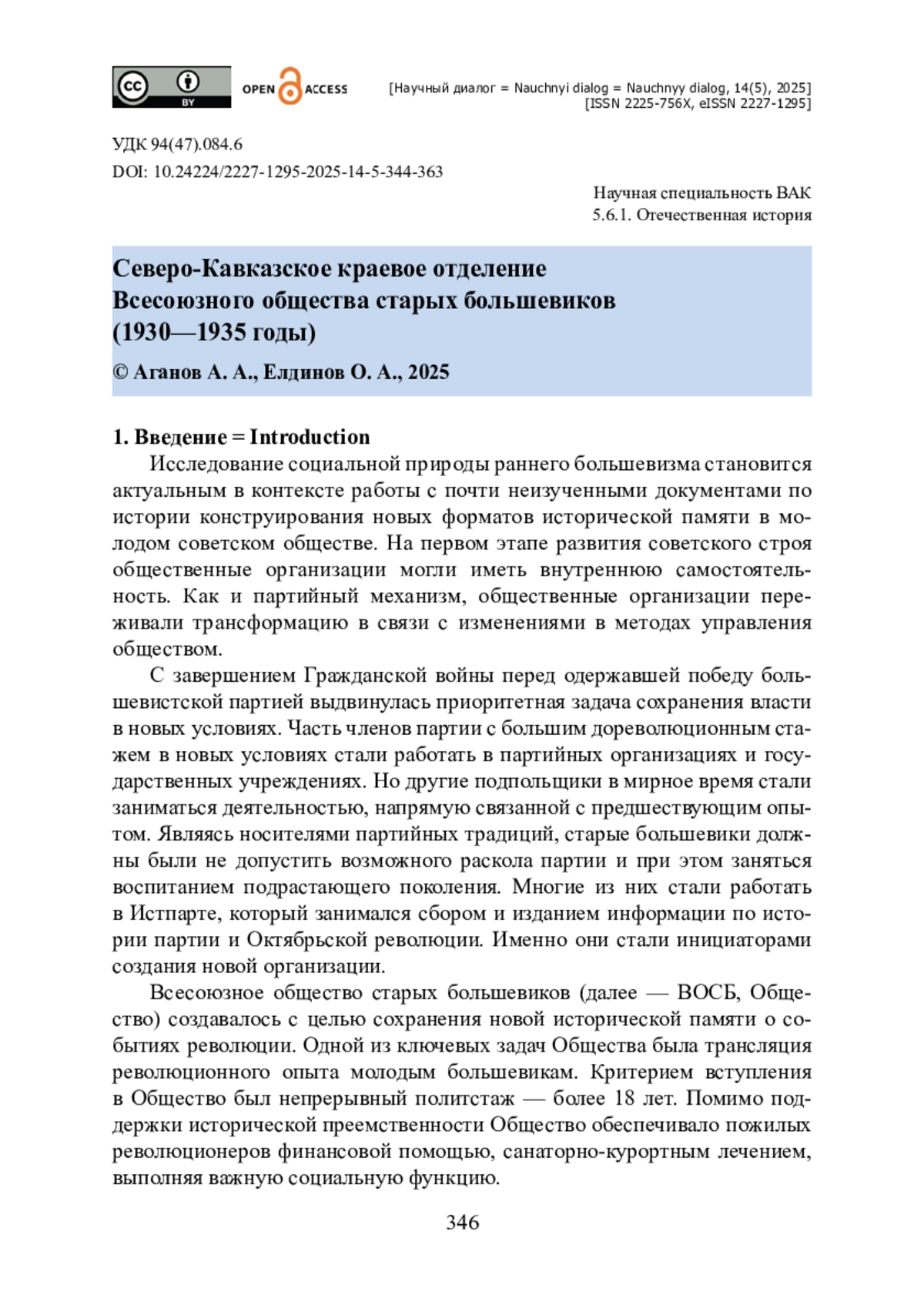 АГАНОВ А. А., ЕЛДИНОВ О. А. СЕВЕРО-КАВКАЗСКОЕ КРАЕВОЕ ОТДЕЛЕНИЕ ВСЕСОЮЗНОГО ОБЩЕСТВА СТАРЫХ БОЛЬШЕВИКОВ (1930—1935 ГОДЫ) // НАУЧНЫЙ ДИАЛОГ. 2025. ТОМ 14, № 5