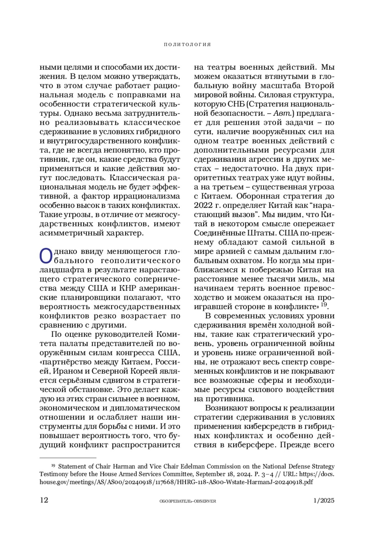 ИВАНОВ О. П. АМЕРИКАНСКАЯ СТРАТЕГИЯ СДЕРЖИВАНИЯ США В УСЛОВИЯХ ПЕРЕХОДА К ПОЛИЦЕНТРИЧНОМУ МИРУ. ИНСТРУМЕНТ ПОЛИТИКИ ГЛОБАЛЬНОГО ДОМИНИРОВАНИЯ // ОБОЗРЕВАТЕЛЬ. 2025. № 1