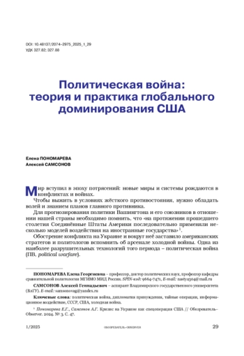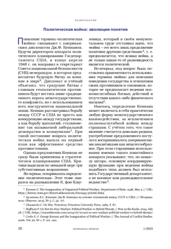 Авторы на основе доктринальных документов и научной литературы показали эволюцию понятия «политическая война». Теоретическая рамка, предложенная Дж. Ф. Кеннаном, за годы противостояния сверхдержав стала основой стратегического планирования Вашингтоном долгосрочных и разрушительных, в том числе тайных операций, по устранению влияния СССР в мире. Концептуально политическая война включает дипломатию принуждения, финансово-экономические способы давления, информационно-психологические и военно-политические операции. Весь этот арсенал в настоящее время направлен против России с целью подрыва её устойчивости и политической субъектности.