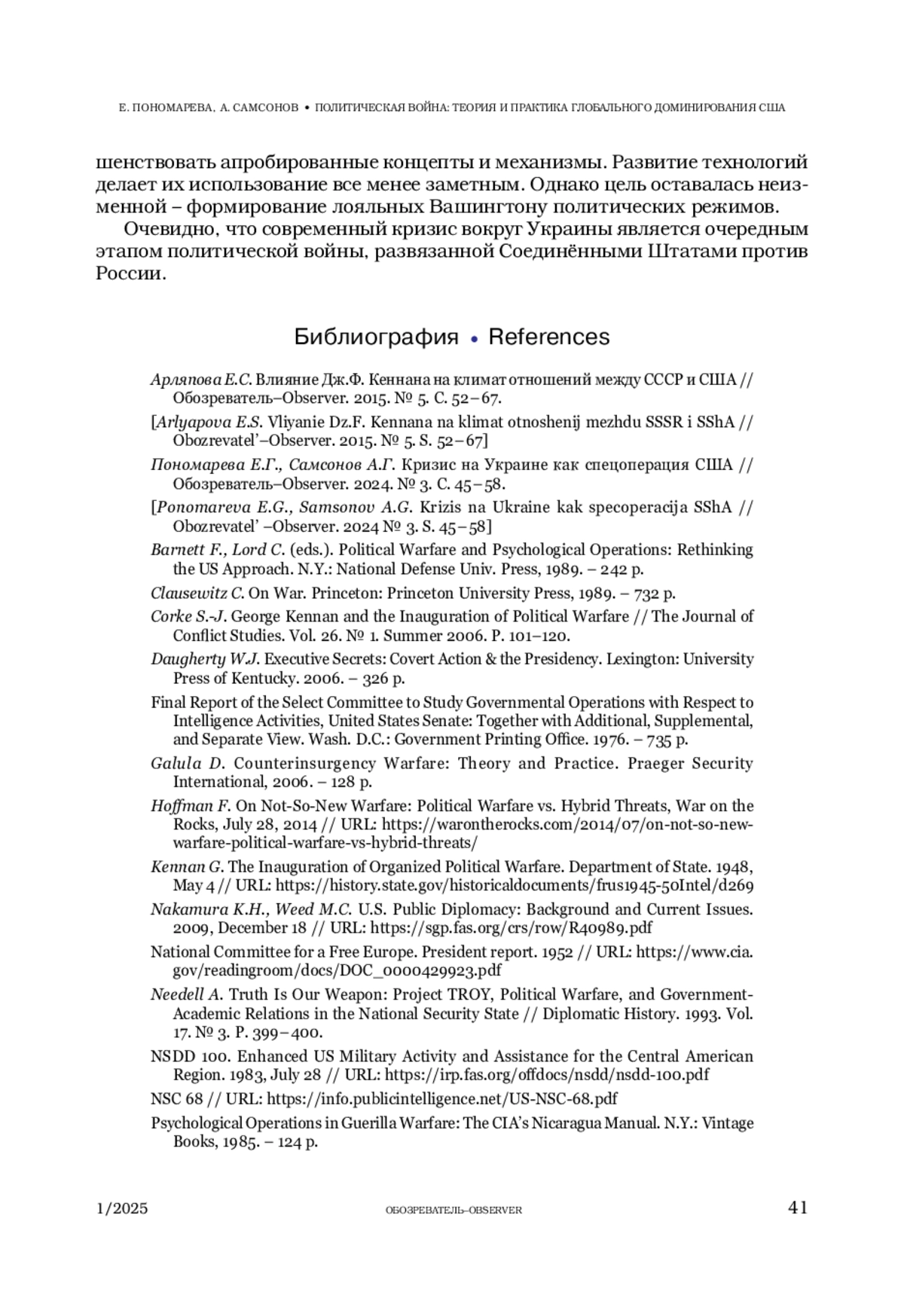2. Пономарева Е.Г., Самсонов А.Г. Кризис на Украине как спецоперация США // Обозреватель-Observer. 2024. № 3. С. 45-58.