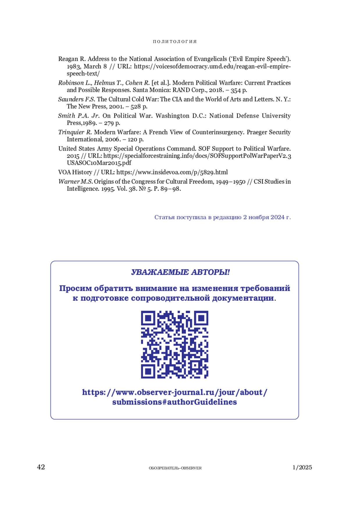 5. Corke S.-J. George Kennan and the Inauguration of Political Warfare // The Journal of Conflict Studies. Vol. 26. № 1. Summer 2006. P. 101-120.