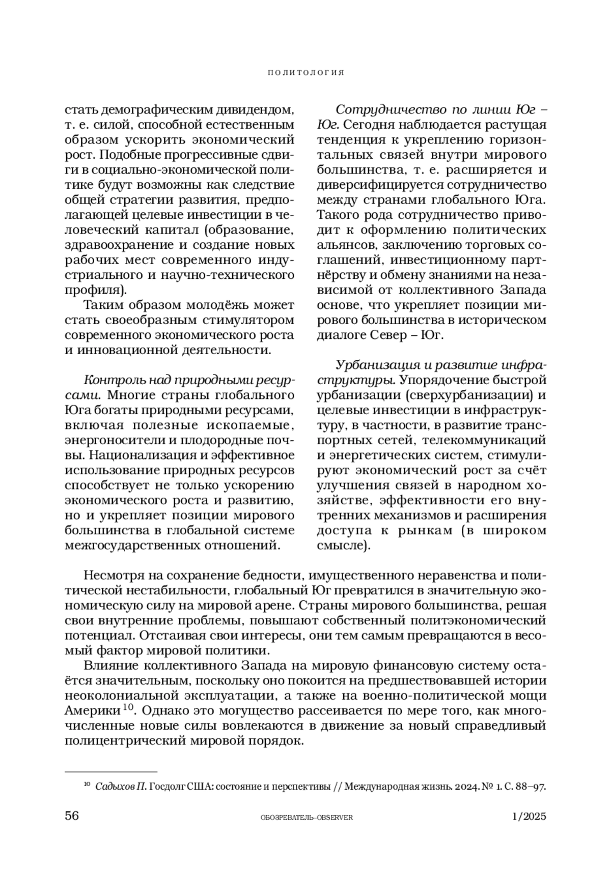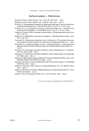 2. Володин А.Г. Возвращение развития: полицентрический мир в поисках новой экзистенциальной парадигмы // Вестник РАН. 2023. Т. 93. № 11. С. 1019-1031.
