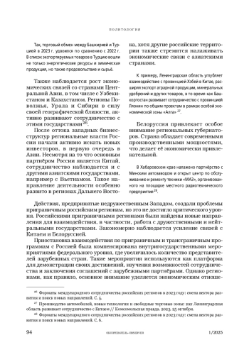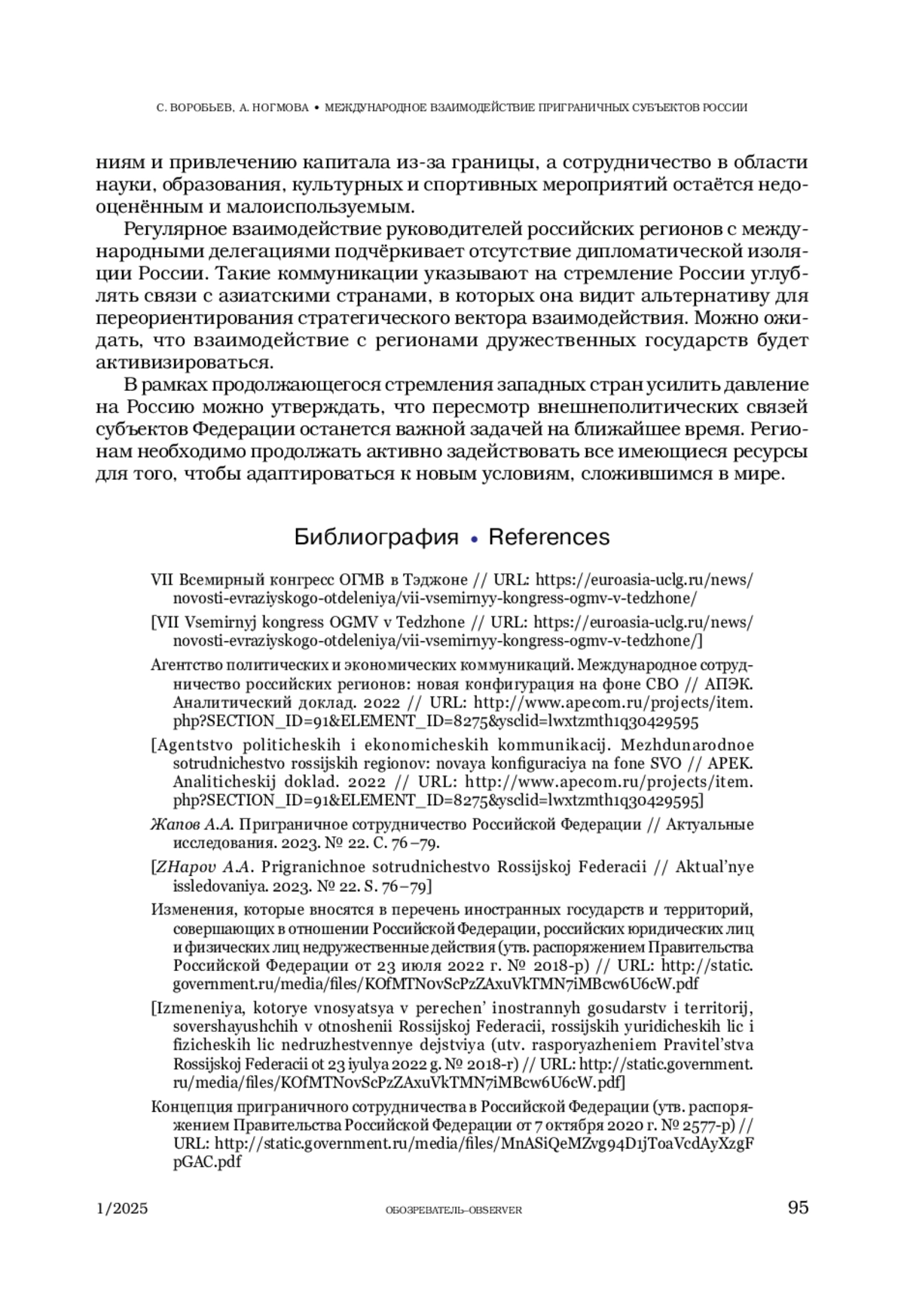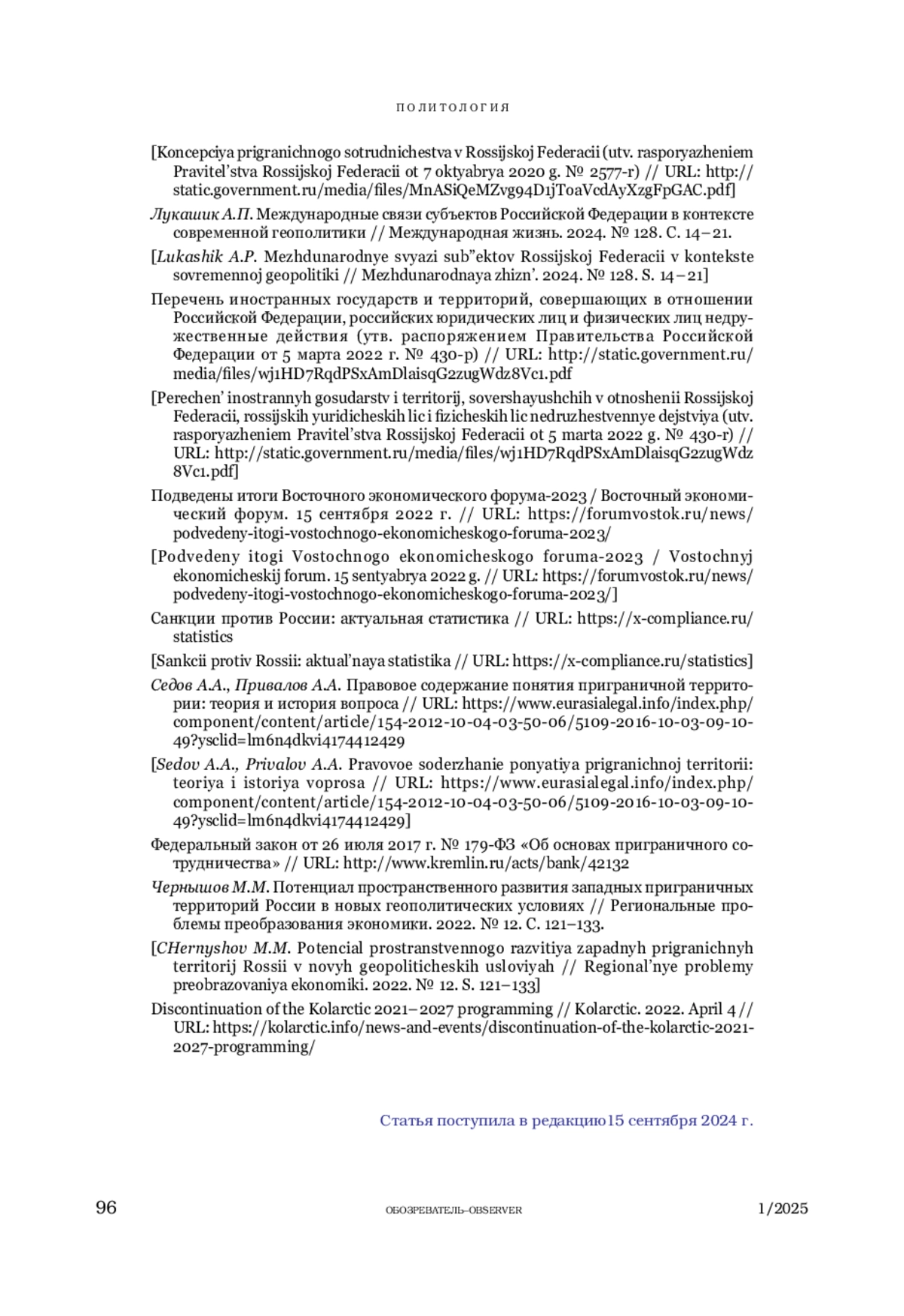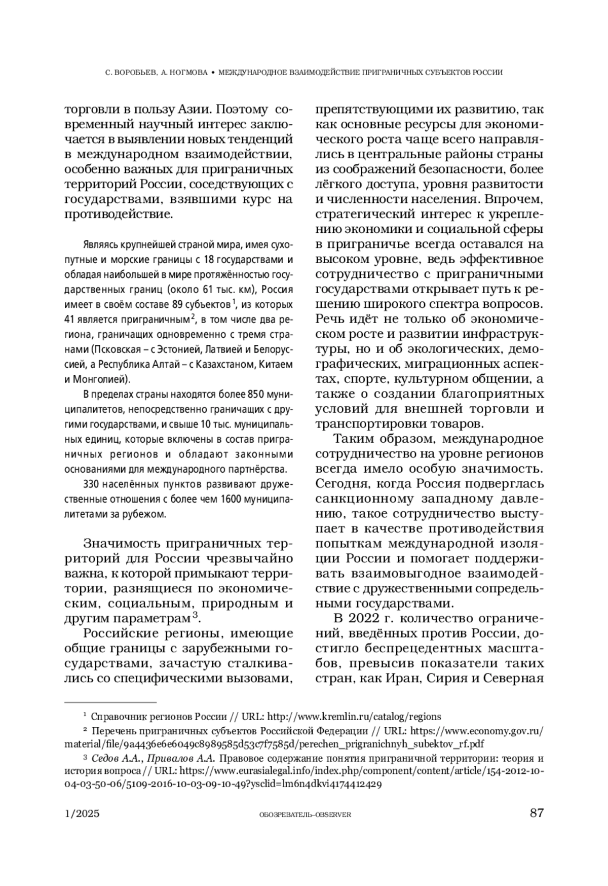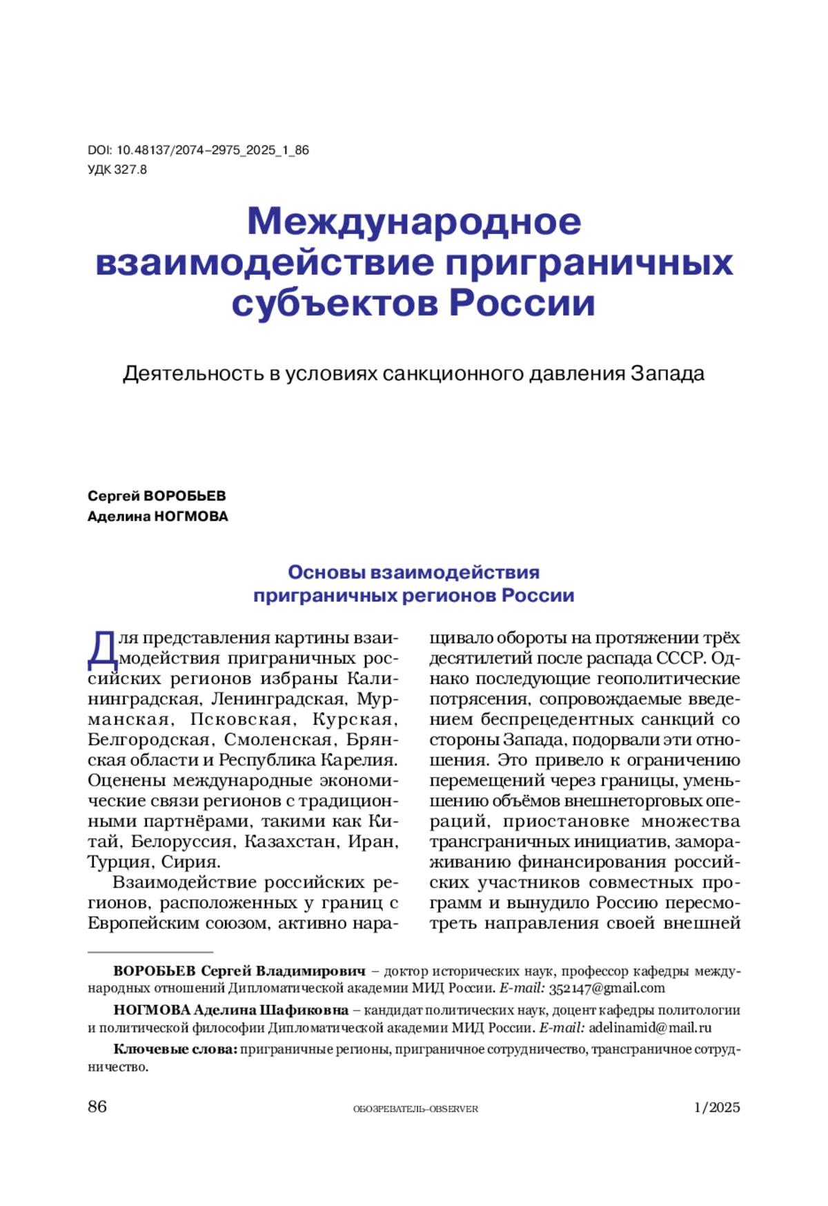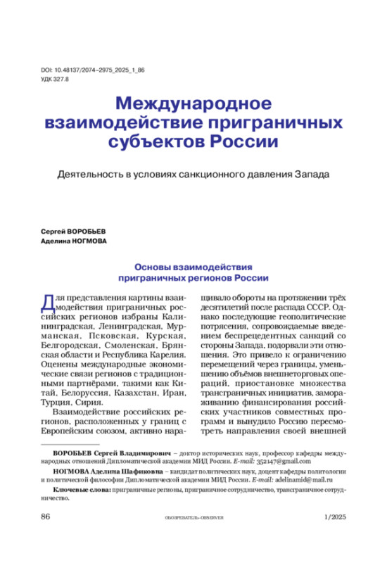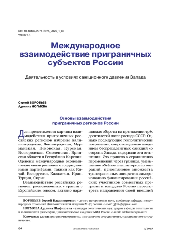 ВОРОБЬЕВ С. В., НОГМОВА А. Ш. МЕЖДУНАРОДНОЕ ВЗАИМОДЕЙСТВИЕ ПРИГРАНИЧНЫХ СУБЪЕКТОВ РОССИИ. ДЕЯТЕЛЬНОСТЬ В УСЛОВИЯХ САНКЦИОННОГО ДАВЛЕНИЯ ЗАПАДА // ОБОЗРЕВАТЕЛЬ. 2025. № 1