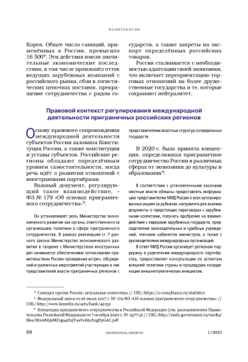 Статья: Международное взаимодействие приграничных субъектов России. Деятельность в условиях санкционного давления Запада (2025)