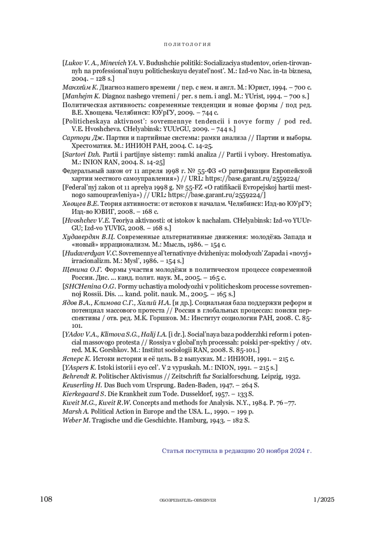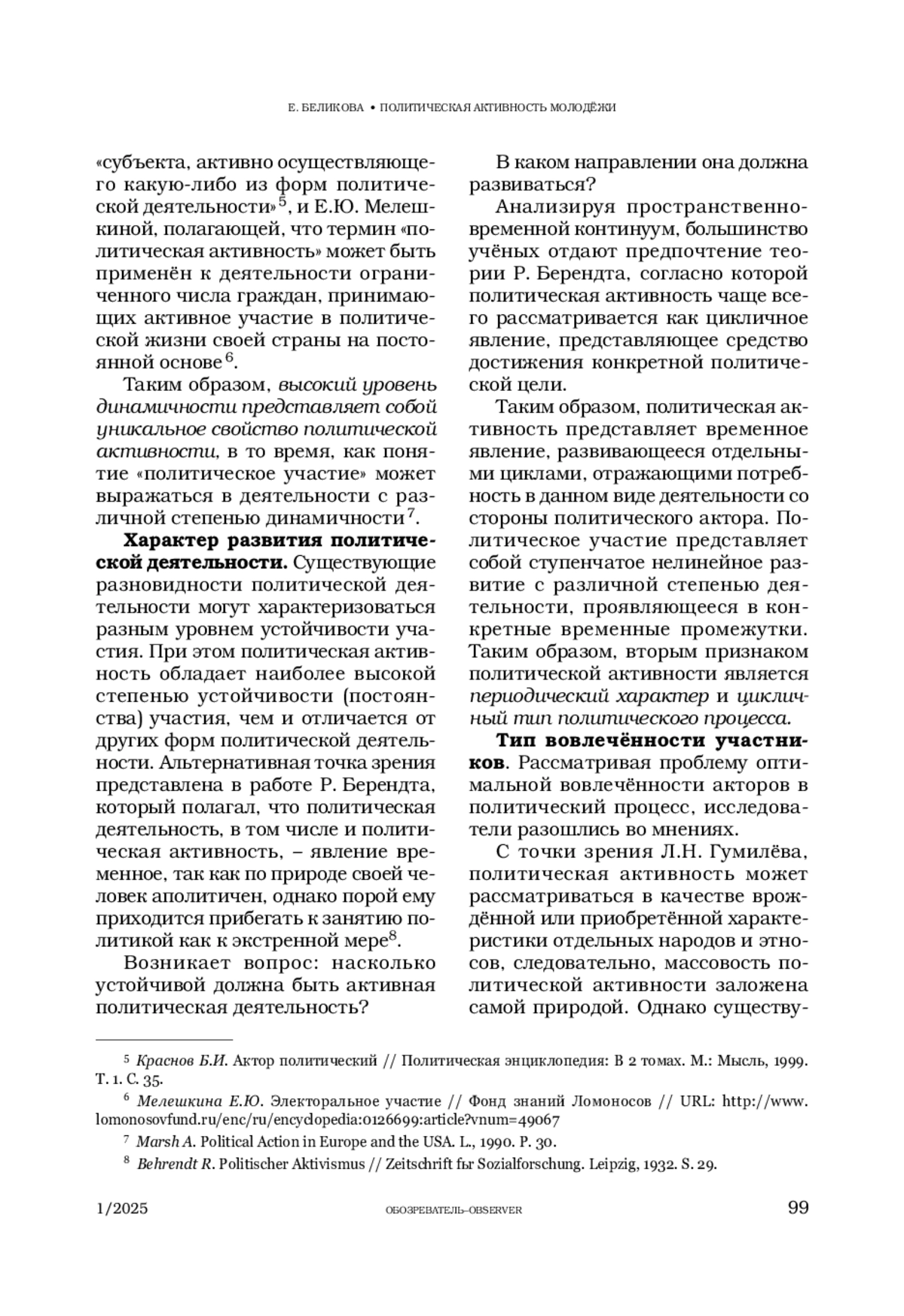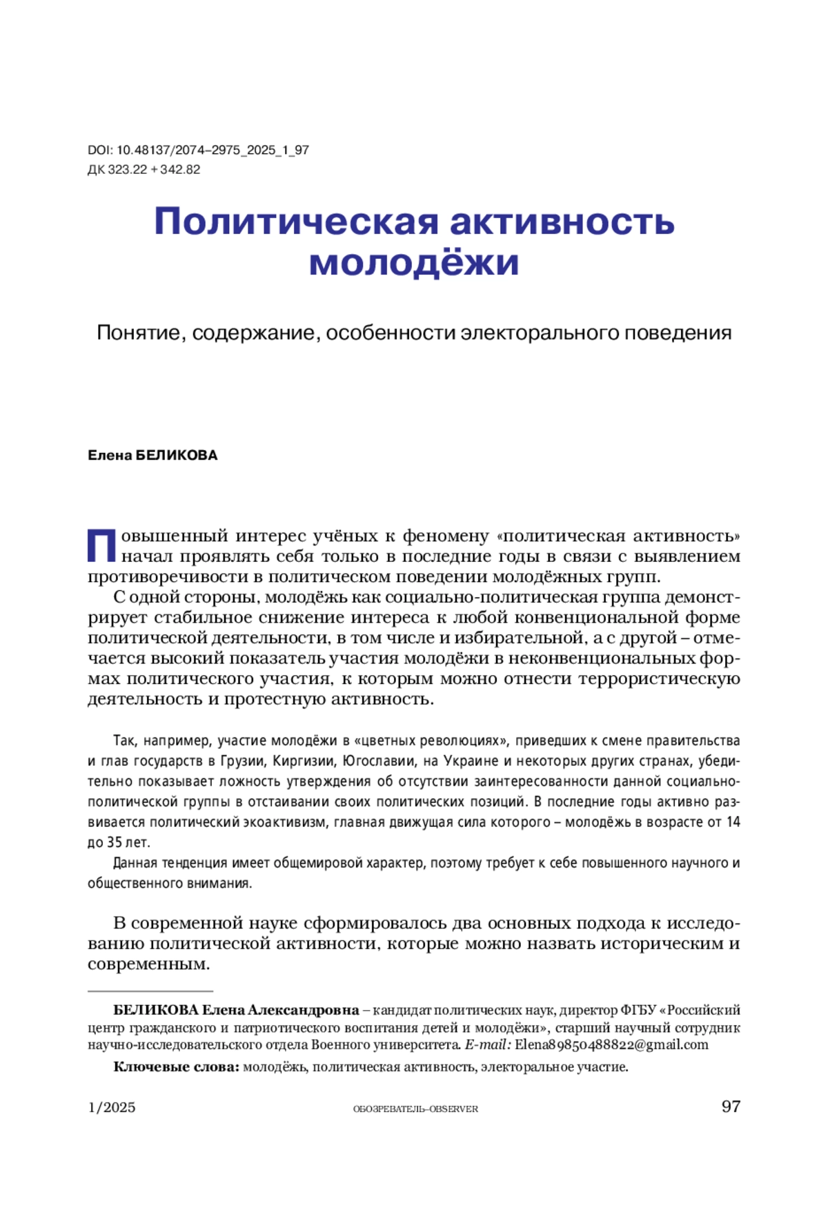 БЕЛИКОВА Е. А. ПОЛИТИЧЕСКАЯ АКТИВНОСТЬ МОЛОДЁЖИ. ПОНЯТИЕ, СОДЕРЖАНИЕ, ОСОБЕННОСТИ ЭЛЕКТОРАЛЬНОГО ПОВЕДЕНИЯ // ОБОЗРЕВАТЕЛЬ. 2025. № 1