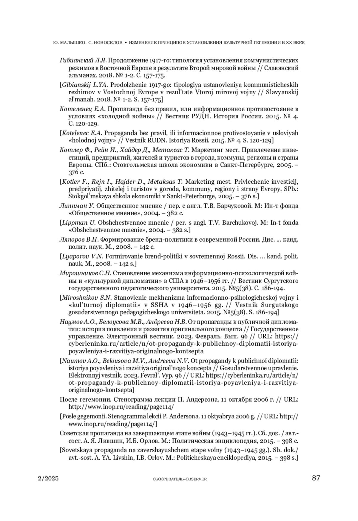 10. Наумов А.О., Белоусова М.В., Андреева Н.В. От пропаганды к публичной дипломатии: история появления и развития оригинального концепта // Государственное управление. Электронный вестник. 2023. Февраль. Вып. 96 // URL: https://cyberleninka.ru/article/n/ot-propagandy-k-publichnoy-diplomatii-istoriyapoyavleniya-i-razvitiya-originalnogo-kontsepta