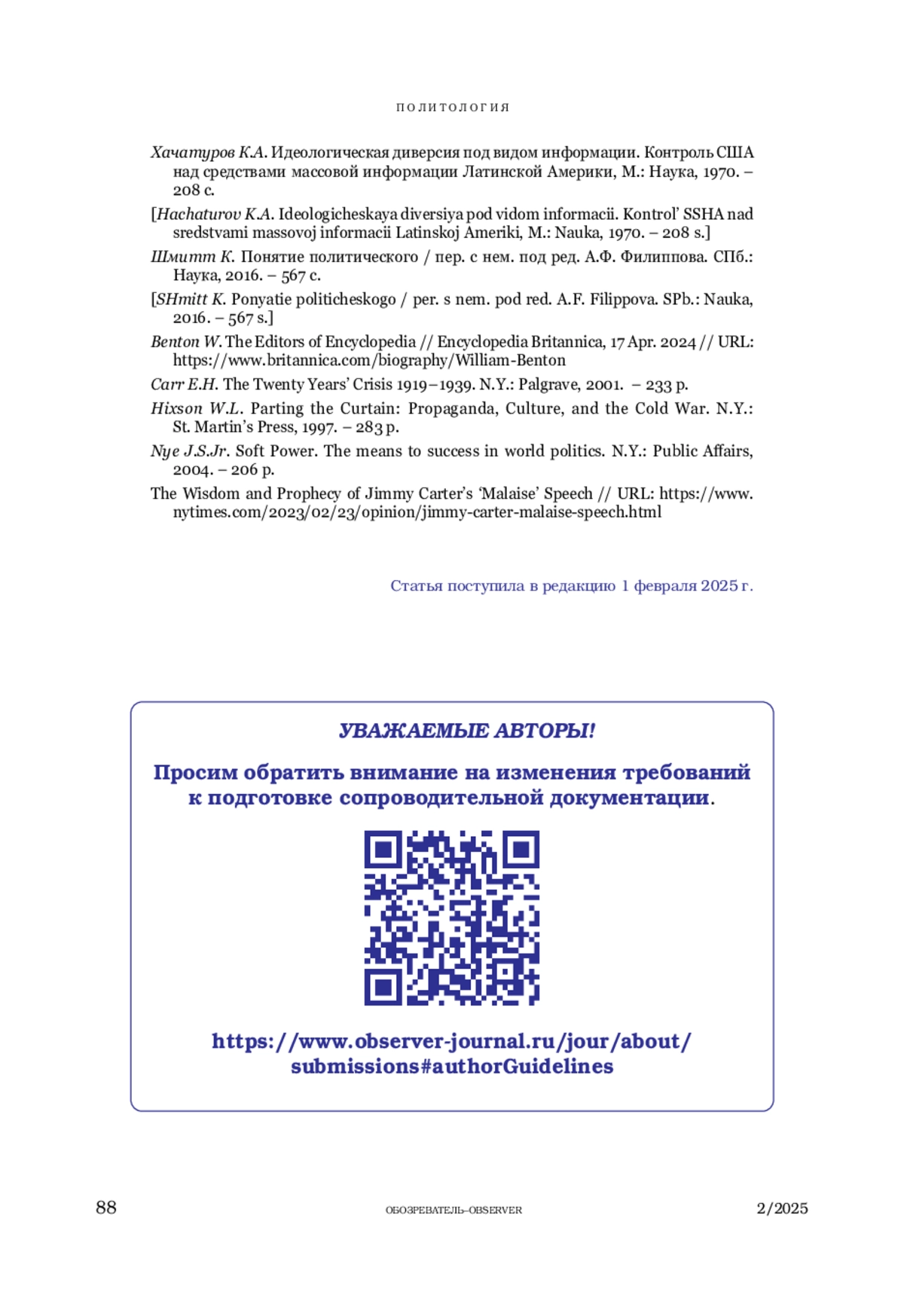 В статье анализируется эволюция концепции «власти привлекательности» в государственной политике на протяжении ХХ в., прослеживается её взаимосвязь с развитием массовой коммуникации, расширением гражданского участия и идеологическими противостояниями. Особое внимание уделяется американскому опыту в сфере публичной дипломатии, а также трансформации пропагандистских стратегий от прямого идеологического воздействия к более тонким формам «мягкой силы.
