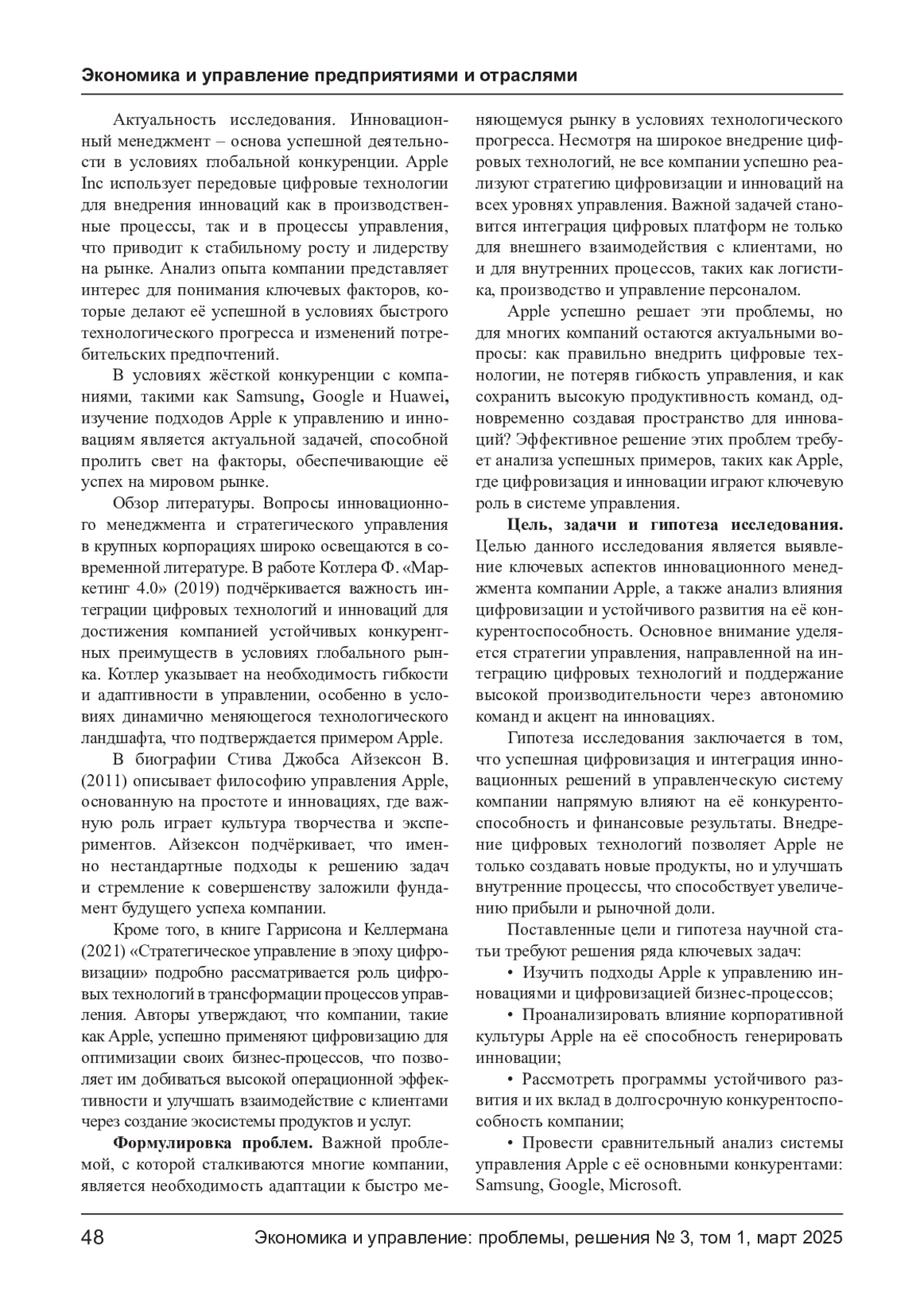 Эффективная система управления в условиях глобализации и высокой конкуренции является основополагающим фактором успеха крупных корпораций. Пример компании Apple Inc. иллюстрирует, как цифровизация бизнес-процессов и внедрение инновационных управленческих стратегий способствуют её устойчивому развитию и укреплению лидерских позиций на мировом рынке высоких технологий. Apple применяет централизованную модель принятия решений в сочетании с высокой степенью автономии продуктовых команд, что позволяет компании внедрять инновации и одновременно поддерживать строгие стандарты качества. Актуальность темы исследования обусловлена необходимостью анализа современных управленческих подходов, которые позволяют компаниям, подобным Apple, сохранять свою конкурентоспособность в условиях стремительного технологического прогресса и меняющегося потребительского спроса. Объектом исследования является система инновационного менеджмента Apple, а предметом - ключевые элементы её стратегии, такие как цифровизация процессов, управление корпоративной культурой и программы устойчивого развития. В ходе исследования проведён детальный анализ внедрения инноваций в управленческую практику Apple, а также их влияние на финансовые и рыночные показатели компании. Результаты показывают, что инновационный подход к управлению способствует улучшению производительности, ускорению процессов принятия решений и увеличению рыночной доли компании. Были рассмотрены примеры успешных внедрений цифровых технологий и их роль в создании продуктов, которые меняют рынок. Таким образом, система управления Apple демонстрирует, как инновационные управленческие стратегии могут стать ключом к успеху в условиях глобальной конкуренции.