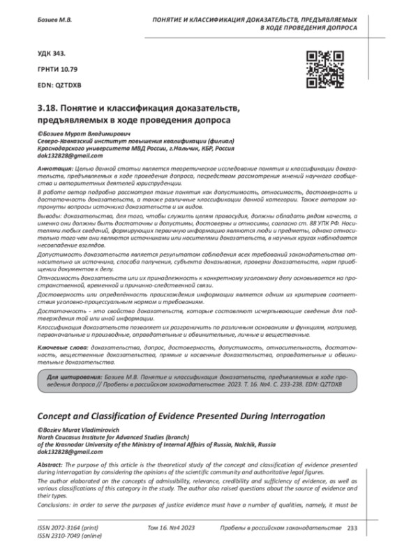Целью данной статьи является теоретическое исследование понятия и классификации доказательств, предъявляемых в ходе проведения допроса, посредством рассмотрения мнений научного сообщества и авторитетных деятелей юриспруденции. В работе автор подробно рассмотрел такие понятия как допустимость, относимость, достоверность и достаточность доказательств, а также различные классификации данной категории. Также автором затронуты вопросы источника доказательств и их видов. Выводы: доказательства, для того, чтобы служить целям правосудия, должны обладать рядом качеств, а именно они должны быть достаточны и допустимы, достоверны и относимы, согласно ст. 88 УПК РФ. Носителями любых сведений, формирующих первичную информацию являются люди и предметы, однако относительно того чем они являются источниками или носителями доказательств, в научных кругах наблюдается несовпадение взглядов. Допустимость доказательств является результатом соблюдения всех требований законодательства относительно их источника, способа получения, субъекта доказывания, проверки доказательств, норм приобщении документов к делу. Относимость доказательств или их принадлежность к конкретному уголовному делу основывается на пространственной, временной и причинно-следственной связи. Достоверность или определённость происхождения информации является одним из критериев соответствия уголовно-процессуальным нормам и требованиям. Достаточность - это свойство доказательств, которые составляют исчерпывающие сведения для подтверждения той или иной информации. Классификация доказательств позволяет их разграничить по различным основаниям и функциям, например, первоначальные и производные, оправдательные и обвинительные, личные и вещественные.