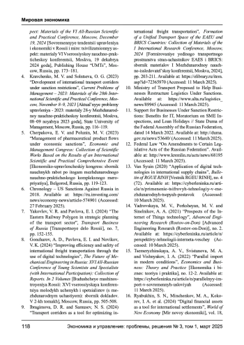 4. Кравченко М. В., Солнцева О. Г. Развитие международных транспортных коридоров в условиях санкционных ограничений // Актуальные проблемы управления - 2023: материалы 28-й Международной научно-практической конференции, Москва, 08-09 ноября 2023 года. - Москва: Государственный университет управления, 2023. - С. 116-119. EDN: OCTPON
