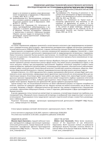 Целью данного исследования является изучение возможностей применения цифровых технологий, а также искусственного интеллекта в деятельности правоохранителей по предупреждению экстремизма и терроризма. Новые технологии позволяют быстро выявлять преступников, что способствует повышению общественной безопасности по сравнению с тем временем, когда применение технического прогресса было невозможным по причине его отсутствия. Преступления распределены во времени и пространстве неравномерно, поэтому простое патрулирование не может обеспечить качественное пресечение преступных действий. Искусственный интеллект способен выявить те точки, где больше всего необходим патруль, это позволяет прекратить преступление не только в конкретно означенном месте, но и близких к нему территориях. Задачи исследования состоят в разработке предложений по расширению возможностей использования цифровых технологий и искусственного интеллекта в процессе осуществления противодействия экстремистским и террористическим преступлениям. Поскольку искусственный интеллект помогает быстро обработать большое количество информации, это позволяет применять данную технологию в разных сферах жизни. Она может решать разнообразные задачи, в том числе оказывать помощь при расследовании преступлений. Подобные технологии позволяют ускорить темпы развития общества, превратить рутинную работу, отнимающую много времени, в быстрый анализ компьютером, который займет несколько минут. Искусственный интеллект способствует развитию экономики, общества, повышению общественной безопасности, помогает правоохранительным органам решать различные задачи. Сделан вывод о том, что искусственный интеллект не имеет собственного разума и не наделен способностью отличать, законные он совершает действия или нет. Именно поэтому его можно использовать как во благо, так и во вред. Например, в борьбе с киберпреступностью ИИ помогает при помощи сотрудничества с банковскими системами, отделениями киберзащиты банков, а также IT-отделами, работающими в сфере противодействия киберпреступности.