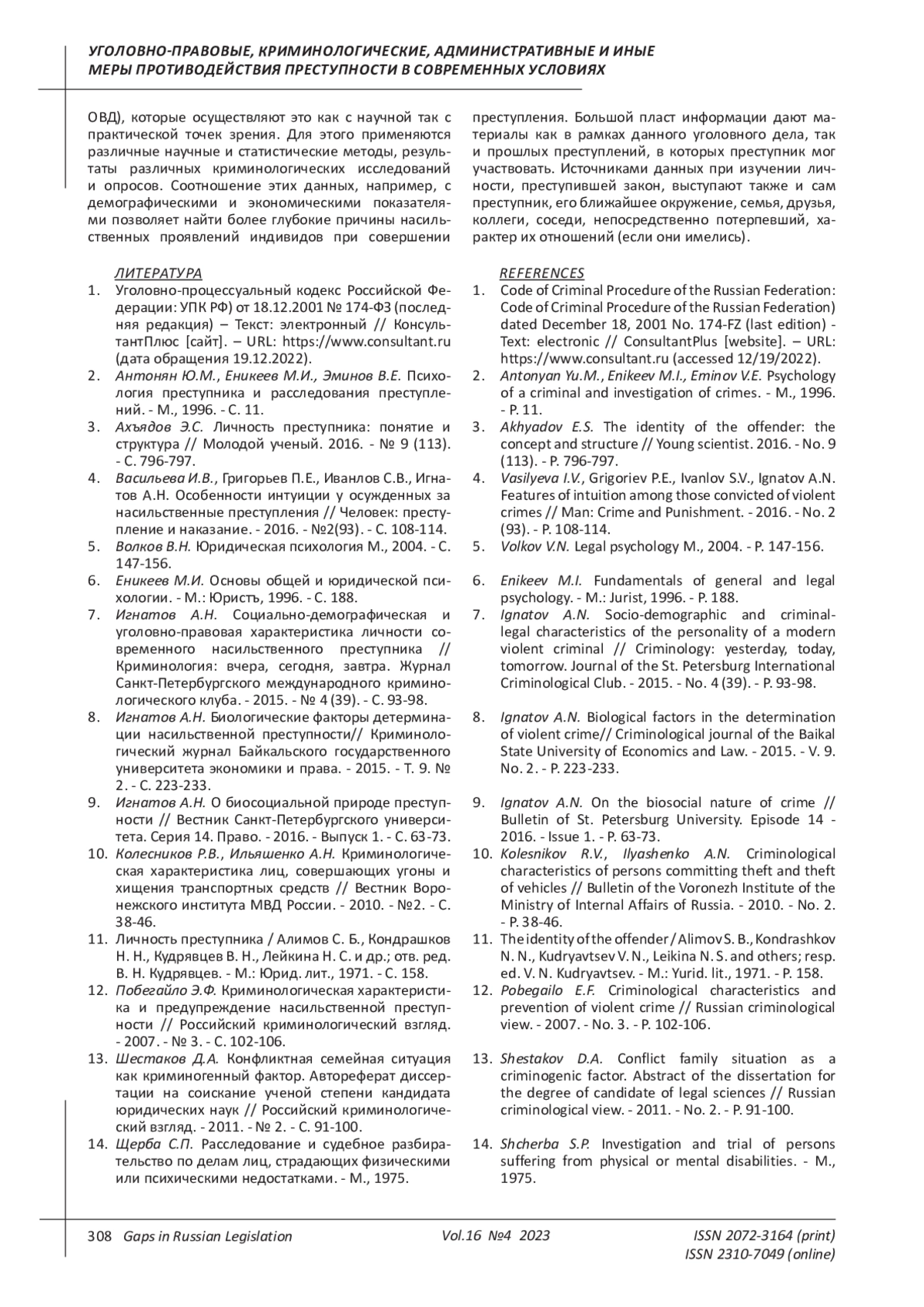 7. Игнатов А.Н. Социально-демографическая и уголовно-правовая характеристика личности современного насильственного преступника // Криминология: вчера, сегодня, завтра. Журнал Санкт-Петербургского международного криминологического клуба. - 2015. - № 4 (39). - С. 93-98. EDN: WCDODZ