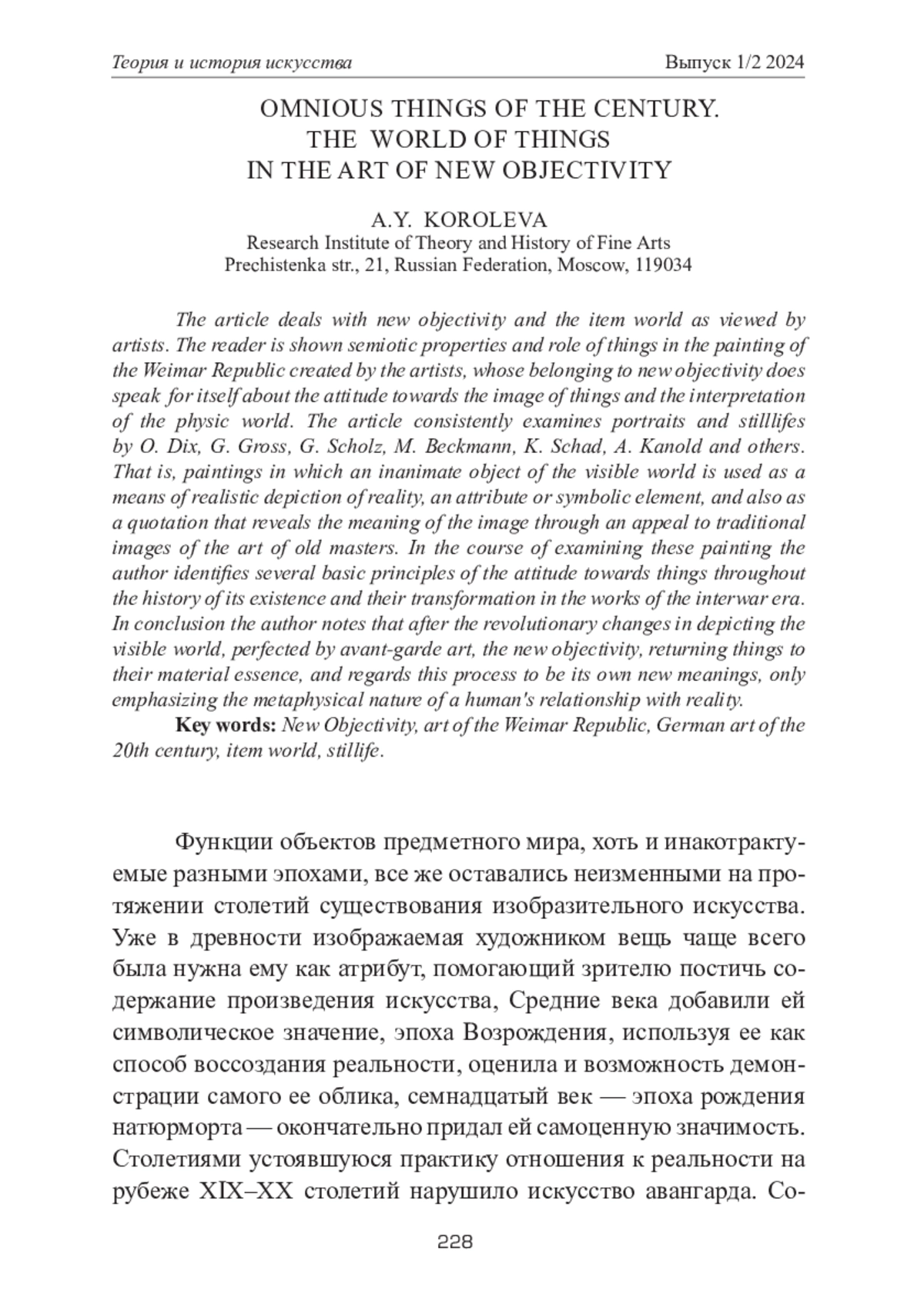 В статье рассматриваются вопросы отношения художников новой вещественности к предметному миру. Читателю предлагается попытка осмысления семиотических свойств и роли вещи в живописи Веймарской республики, созданных художниками, принадлежность которых к направлению новой вещественности уже само по себе говорит об отношении к изображению вещи и трактовке предметного мира. В статье последовательно рассмотрены портреты и натюрморты О. Дикса, Г. Гросса, Г. Шольца, М. Бекманна, К. Шада, А. Канольда и других. То есть картины, в которых неодушевленный объект видимого мира используется в качестве средства реалистического изображения действительности, атрибута или символического элемента, а также в качестве цитаты, раскрывающей смысл изображения через обращение к традиционным образам искусства старых мастеров. В ходе рассмотрения художественного материала автор выделяет несколько основных принципов отношения к вещи в живописи на протяжении истории ее существования и их трансформацию в картинах межвоенной эпохи. В заключение автор отмечает, что после революционного переворота в отношении к изображению видимого мира, совершенного искусством авангарда, новая вещественность, возвращая вещи ее материальную вещную сущность, все же видит в этом процессе свои новые смыслы, лишь подчеркивающие метафизический характер взаимоотношений человека с действительностью