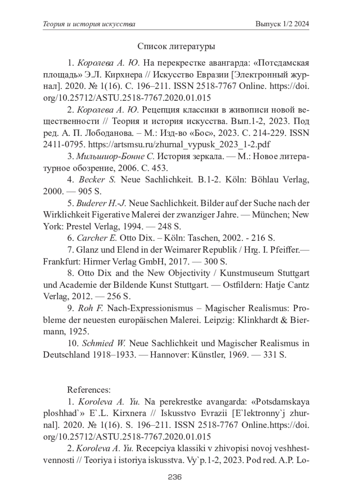 2. Королева А. Ю. Рецепция классики в живописи новой вещественности // Теория и история искусства. Вып.1-2, 2023. Под ред. А. П. Лободанова. - М.: Изд-во “Бос”, 2023. С. 214-229. ISSN 2411-0795. https://artsmsu.ru/zhurnal_vypusk_2023_1-2.pdf. EDN: JWPVSH