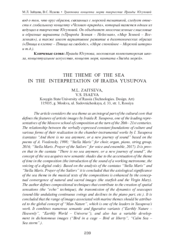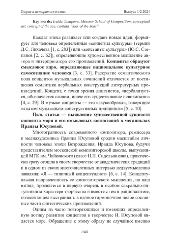 В статье рассматривается концепт моря как составная часть культурного ядра, определяющего особенности художественных образов сочинений одного из ведущих представителей московской композиторской школы рубежа XX–XXI вв. Ираиды Рафаэльевны Юсуповой. Обусловлена взаимосвязь между вербально выраженными константными основаниями культуры и различными формами их реализации в камерно-инструментальных сочинениях И. Юсуповой (кантатах «И моря уже нет, или Новое путешествие звука» на стихи А. Введенского, 1998; «Stella Maris» для хора, органа, фортепиано, струнной группы, 2016; «Stella Maris. Молитва моряков» для голоса и ансамбля, 2017). Научно обосновано, что в кантате «И моря уже нет, или Новое путешествие звука» концепт моря обретает новые смысловые оттенки благодаря акцентированию в сочинении темы времени (введение звука работающего метронома, озвучивание цифрового кода). На основе анализа кантат «Stella Maris» и «Stella Maris. Молитва моряков» сделан вывод об усилении аксиологической значимости темы моря в музыкальных текстах сочинений при помощи концептуального сближения природных и сакральных образов (морской звезды и Девы Марии). Определены композиторские приемы, способствующие созданию пространственных ощущений (прием «эха»), передаче динамики морских пейзажей (звукоизобразительные волнообразные непрерывные раскачивания и спады в партии фортепиано и т. д.). Сделан вывод о том, что круг образов, связанных с морской тематикой, следует отнести к глобальному концепту «Человек-природа», который является одним из ведущих в творчестве Юсуповой. Он объединяет многочисленные смысловые и образные варианты («Природа Земная – Небесная», «Мир Земной – Вселенная»), а также имеет вариативное развитие в дихотомических образах («Птица в клетке – Птица на свободе», «Море спокойное – Морской шторм» и т. д.)
