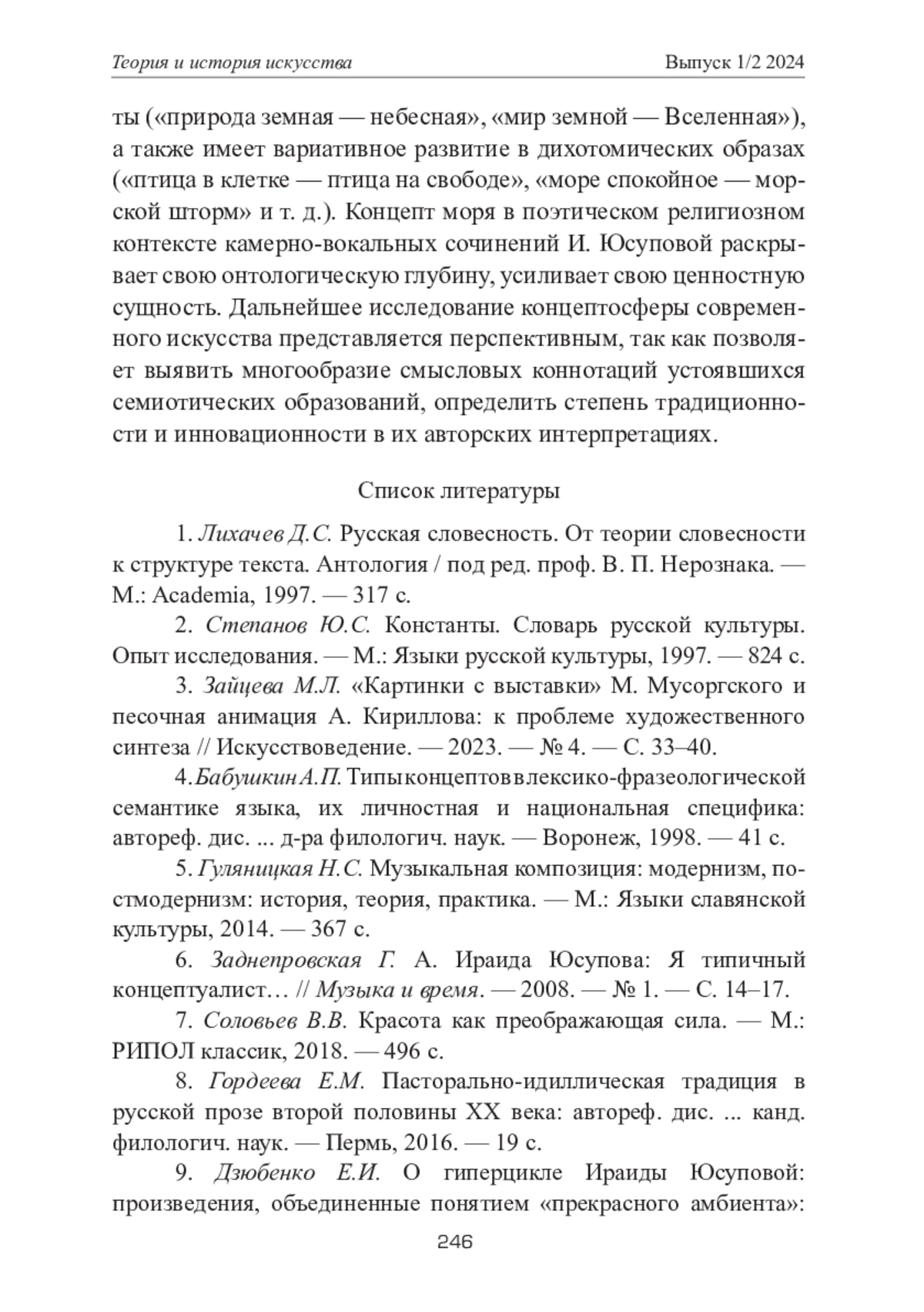 6. Заднепровская Г. А. Ираида Юсупова: Я типичный концептуалист… // Музыка и время. - 2008. - № 1. - С. 14-17. EDN: KLTIAV