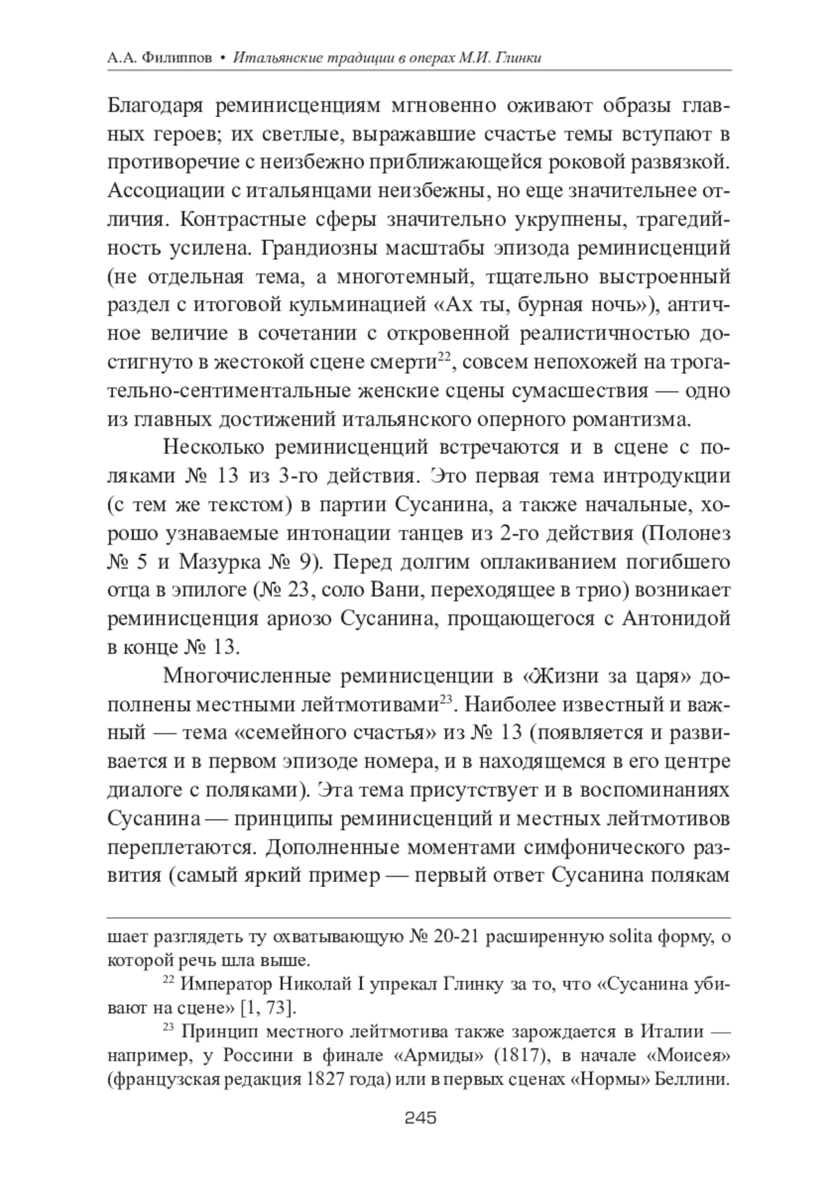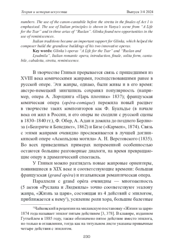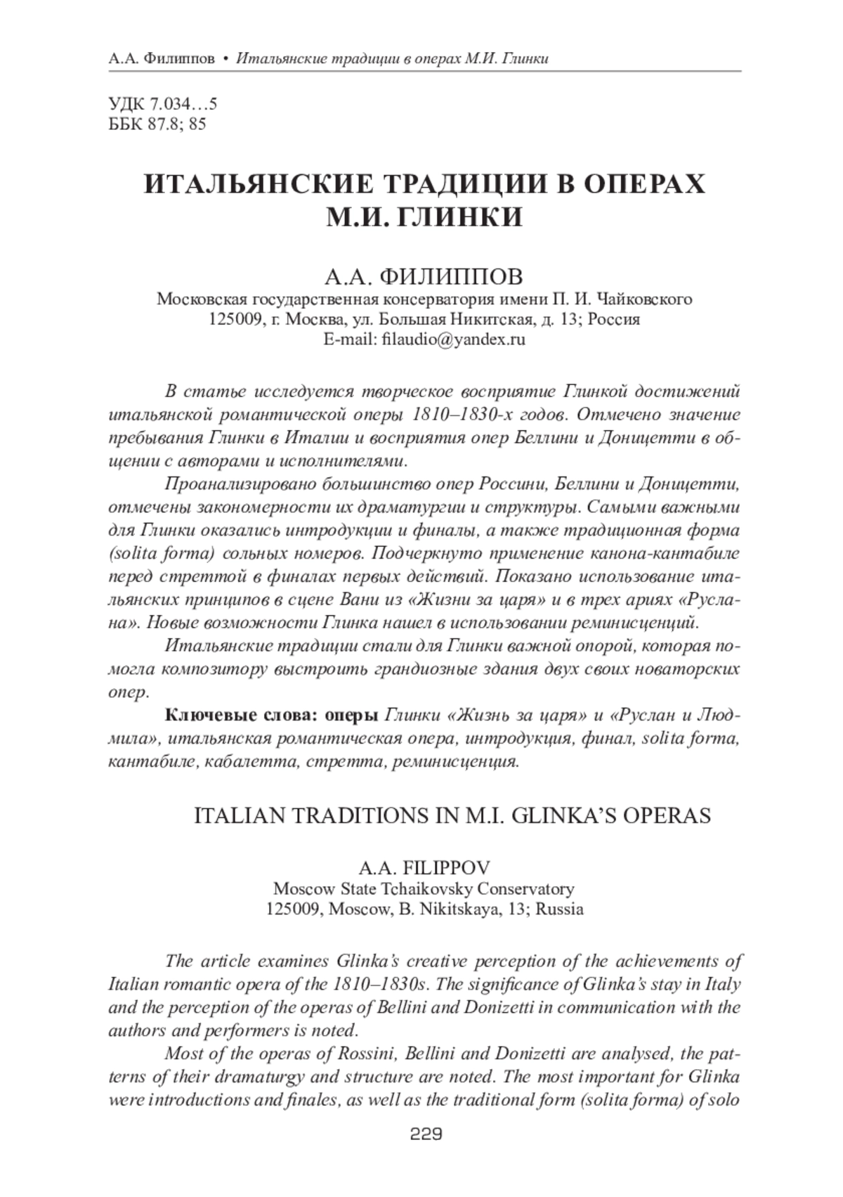 В статье исследуется творческое восприятие Глинкой достижений итальянской романтической оперы 1810–1830-х годов. Отмечено значение пребывания Глинки в Италии и восприятия опер Беллини и Доницетти в общении с авторами и исполнителями. Проанализировано большинство опер Россини, Беллини и Доницетти, отмечены закономерности их драматургии и структуры. Самыми важными для Глинки оказались интродукции и финалы, а также традиционная форма (solita forma) сольных номеров. Подчеркнуто применение канона-кантабиле перед стреттой в финалах первых действий. Показано использование итальянских принципов в сцене Вани из «Жизни за царя» и в трех ариях «Руслана». Новые возможности Глинка нашел в использовании реминисценций. Итальянские традиции стали для Глинки важной опорой, которая помогла композитору выстроить грандиозные здания двух своих новаторских опер