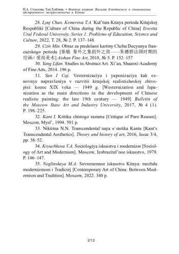 28. Люй Чао, Кемерова Т.А. Культура Китая периода Китайской Республики // Известия УрФУ. Серия 1: Проблемы образования, науки и культуры. - 2022. - Т. 28. - № 2. - С. 137-148. EDN: QBXLBA