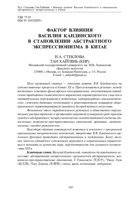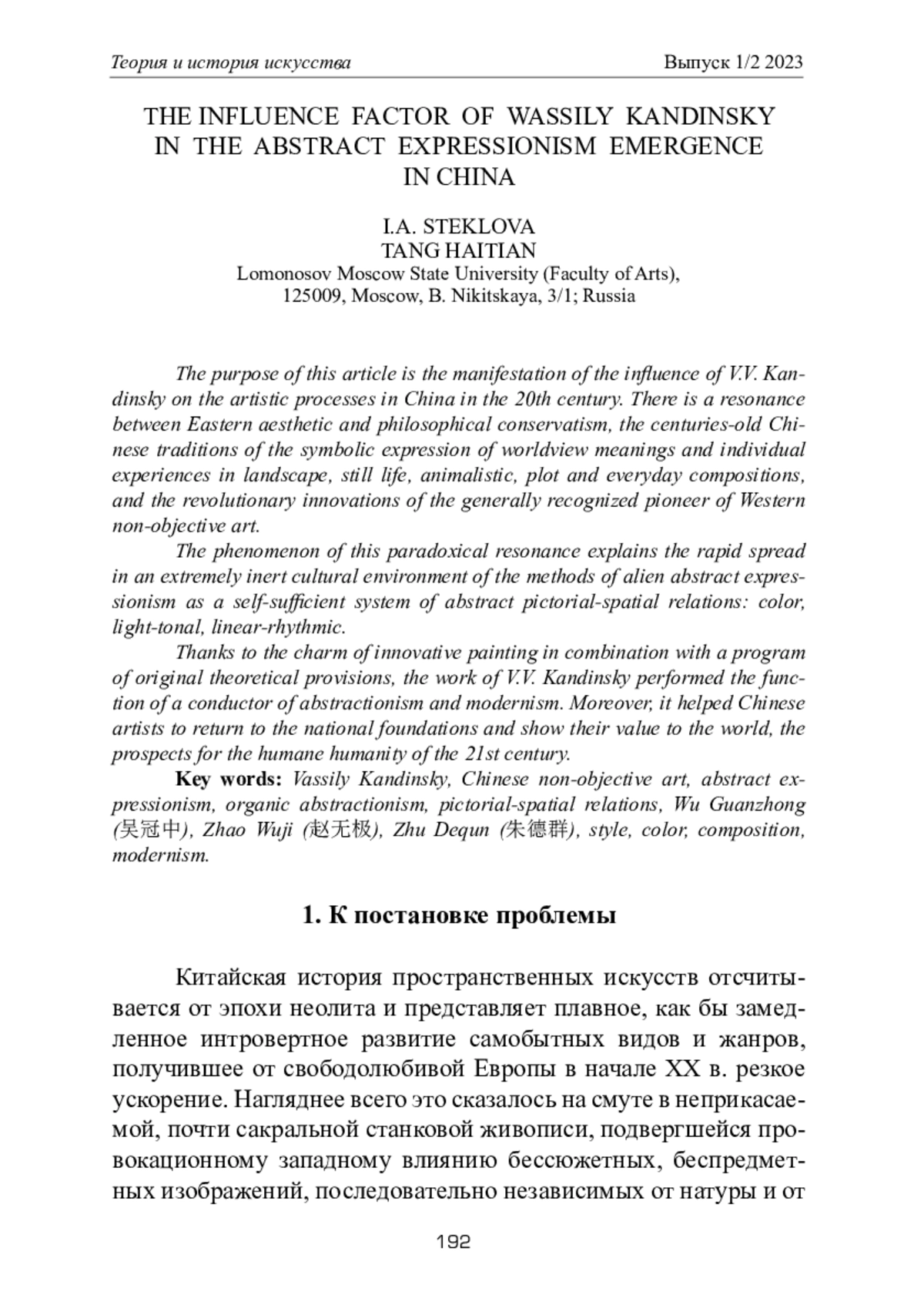 Цель настоящей статьи — показать влияние В. В. Кандинского на художественные процессы в Китае XX в. Прослеживается резонанс между восточным эстетико-философским консерватизмом, многовековыми китайскими традициями символического выражения мировоззренческих смыслов и индивидуальных переживаний в пейзажных, натюрмортных, анималистических, сюжетно-бытовых композициях и революционными новациями общепризнанного первооткрывателя западного беспредметного искусства. Феноменом этого парадоксального резонанса и объясняется стремительное распространение в чрезвычайно инертной культурной среде приемов чуждого абстрактного экспрессионизма как самодостаточной системы отвлеченных живописно-пространственных отношений: цветовых, светотональных, линейно-ритмических. Благодаря обаянию новаторской живописи в комплексе с программой оригинальных теоретических положений, творчество В. В. Кандинского выполнило функцию проводника абстракционизма и модернизма. Более того, оно помогло китайским художникам вернуться к национальным первоосновам и показать их ценность миру, перспективность для гуманного человечества XXI в