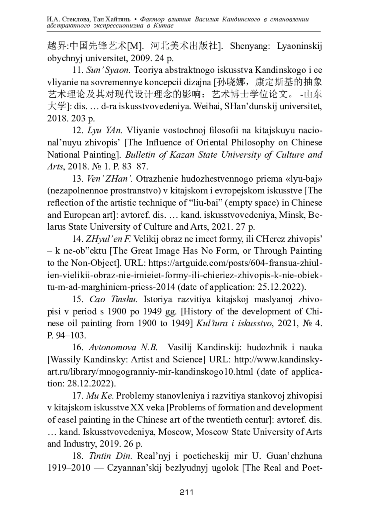 11. Сунь Сяон. Теория абстрактного искусства Кандинского и ее влияние на современные концепции дизайна: дис. … д-ра искусствоведения. - Вэйхай: Шаньдунский университет, 2018. - 203 с.