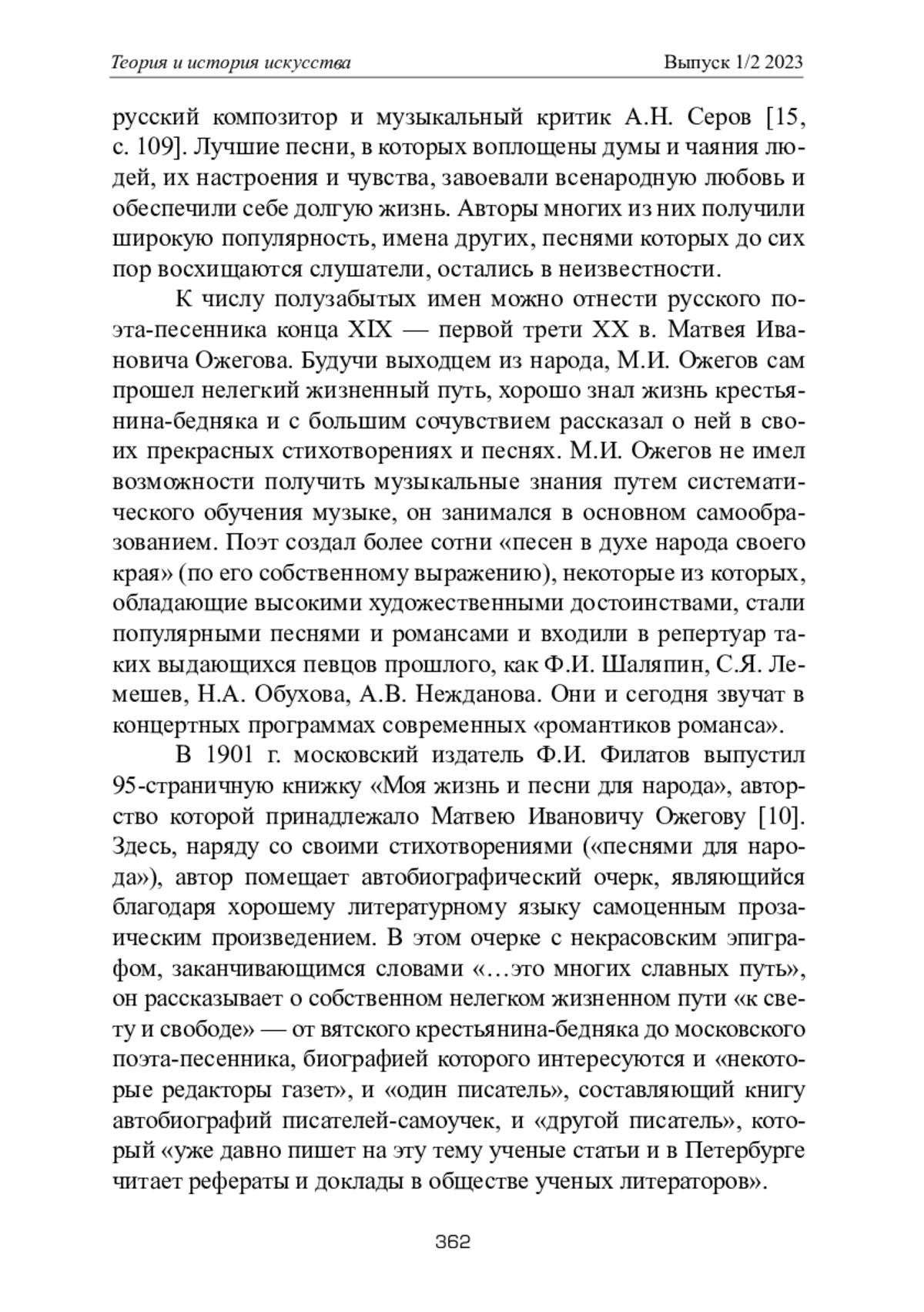 Статья посвящена музыкально-поэтическому творчеству талантливого русского писателя-песенника конца XIX — начала XX в. М. И. Ожегова. Особо подчеркивается, что, будучи выходцем из крестьян деревни Михино Нолинского уезда Вятской губернии, Ожегов хорошо знал жизнь крестьянина-бедняка и с большим сочувствием рассказывал о ней в своих прекрасных стихотворениях и песнях. М. И. Ожегов не имел возможности получить систематического общего и музыкального образования и все знания получил в основном посредством самообразования. Поэт-самоучка написал более сотни «песен в духе народа своего края», некоторые из которых, обладающие высокими художественными достоинствами, стали популярными песнями и романсами и входили в репертуар таких выдающихся русских певцов прошлого, как Ф. И. Шаляпин, С. Я. Лемешев, Н. А. Обухова, А. В. Нежданова. Они и сегодня звучат в концертных программах современных «романтиков романса». В статье рассматриваются важнейшие вехи биографии Ожегова, прошедшего нелегкий жизненный путь от крестьянина из вятской глубинки до известного московского поэта-песенника, автора нескольких поэтических книг, составителя популярных сборников песен, выходивших многотысячными тиражами, активного участника Суриковского литературно-музыкального кружка. Освещается история создания и песенного бытования лучших произведений музыкально-поэтического наследия Ожегова, которые получили вторую жизнь в качестве песен и романсов, стали практически народными. Отмечено, что заслуги М. И. Ожегова в области поэтического творчества еще в 1930 году оценила «Литературная газета», назвав его «оригинальным и, вероятно, единственным в русской литературе писателем-песенником»