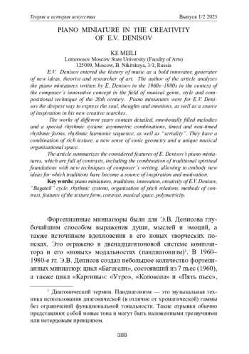 Э. В. Денисов вошел в историю музыки как смелый новатор, генератор новых идей, теоретик и исследователь искусства. Автор статьи анализирует фортепианные миниатюры, написанные Э. В. Денисовым в 1960–1980-е гг., в контексте новаторской концепции композитора в области музыкального жанра, стиля и композиционной техники XX в. Фортепианные миниатюры были для Э. В. Денисова глубочайшим способом выражения души, мыслей и эмоций, а также источником вдохновения в его новых творческих поисках. Произведения разных лет содержат развернутые, эмоционально наполненные мелодии и особую ритмическую систему: асимметричные сочетания, тактовые и нетактовые ритмические формы, ритмическую гармоническую последовательность, а также «серийность». Они обладают сочетанием богатой фактуры, нового ощущения звуковой геометрии и уникальности музыкального организационного пространства. В статье обобщаются рассмотренные особенности фортепианных миниатюр Э. Денисова, которые насыщены контрастами и сочетанием традиционных духовных устоев с новыми техниками композиторского письма, позволяющими воплощать новые идеи, для которых традиции стали источником вдохновения и мотивации