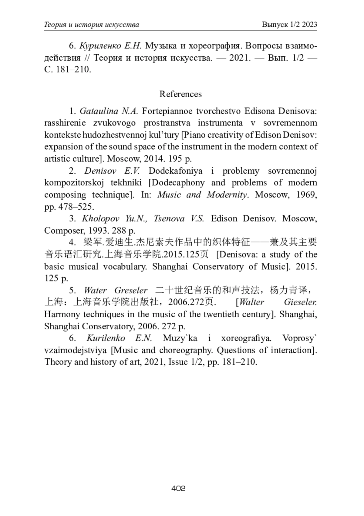 6. Куриленко Е.Н. Музыка и хореография. Вопросы взаимодействия // Теория и история искусства. - 2021. - Вып. 1/2 - С. 181-210. EDN: PVRRWQ