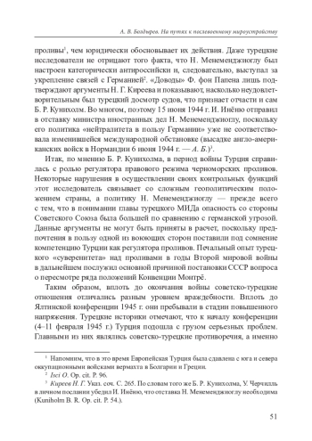 В статье исследуются взгляды турецких исследователей на развитие советско-турецких отношений от победы под Сталинградом в 1943 г. до Ялтинской конференции 1945 г. Как показывает автор, к конференции в Крыму (4–11 февраля 1945 г.) Советский Союз и Турция подошли с грузом взаимных претензий и обвинений. Это дало основание турецким исследователям считать этап, начавшийся после Ялты, наиболее драматическим периодом в отношениях между СССР и Турцией за всю войну.