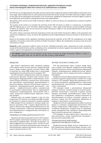 Участковые уполномоченные полиции (далее - УУП) играют важную роль в жизни общества и государства. Они являются тем звеном в системе охраны общественного порядка и органов внутренних дел, которое тесно взаимодействует с населением в ходе осуществления своей служебной деятельности на обслуживаемых административных участках. УУП обеспечивают безопасность территории обслуживаемого участка, осуществляют профилактическую работу, принимают меры по предотвращению, выявлению и пресечению правонарушений, преступлений. УУП выступает своеобразным мостом между населением и правоохранительными органами, помогая полиции выявлять правонарушения и преступления на ранней стадии, что дает возможность быстро реагировать на них, предотвращать их дальнейшее распространение. УУП сигнализируют о том, в каком состоянии находится оперативная обстановка на обслуживаемых ими участках, что позволяет ОВД эффективно планировать свою работу и выполнять возложенные на них функции и обязанности. Особенности несения службы УУП, а также ее формы, рассмотрены рядом авторов [4,5,6,8,9,16]. Целью написания исследовательской работы является рассмотрение деятельности УУП, того в каких формах она осуществляется, согласно ФЗ от 7 февраля 2011 г. № 3-ФЗ «О полиции», Приказу МВД России от 29 марта 2019 г. № 205 «О несении службы участковым уполномоченным полиции на обслуживаемом административном участке и организации этой деятельности». Автором сделан вывод о важности роли деятельности УУП в предупреждении и пресечении правонарушений, преступлений, а также о важности реализации служебной деятельности во всех пяти формах несения службы. На основе анализа нормативной базы, регулирующей деятельность УУП, отмечается, полнота ее правовой регламентации, положительный результат деятельности участковых уполномоченных, сочетание различных направлений несения службы в пяти формах.