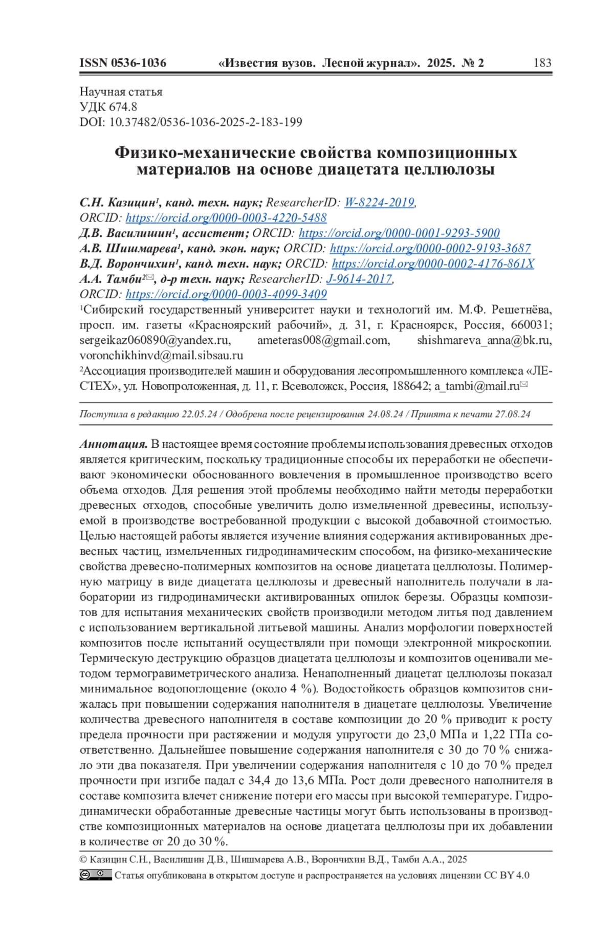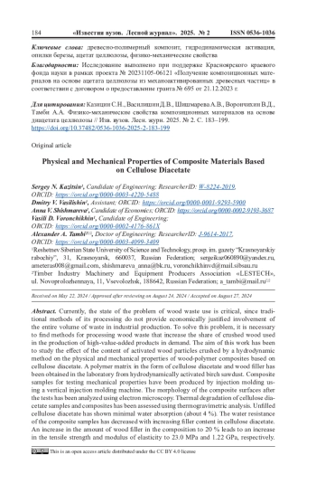 6. Казицин С.Н., Василишин Д.В., Шишмарева А.В., Добрынкина Д.Д., Ворончихин В.Д. Исследование процесса получения ацетата целлюлозы из механоактивированных частиц березы // Хвойные бореал. зоны. 2024. Т. 42, No 2. С. 73-79. EDN: EIJTZD
