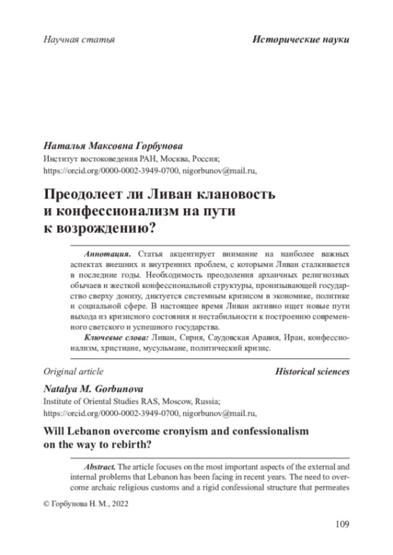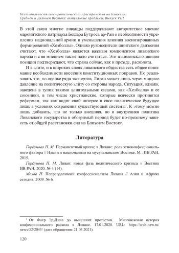2. Горбунова Н. М. Ливан: новая фаза политического кризиса // Вестник ИВ РАН. 2020. № 4 (14). EDN: MTRGKU