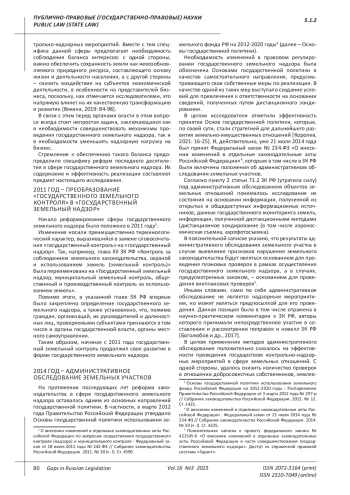 В целом исследователи отметили эффективность принятия Основ государственной политики, которые, по своей сути, стали стратегией для дальнейшего развития земельно-имущественных отношений [Королев, 2021: 16-25]. И, действительно, уже 21 июля 2014 года был принят Федеральный закон № 234-ФЗ «О внесении изменений в отдельные законодательные акты Российской Федерации»4, которым в том числе в ЗК РФ были включены положения об административном обследовании земельных участков. Согласно пункту 2 статьи 71.2 ЗК РФ (утратила силу) под административным обследованием объектов земельных отношений понималось исследование их состояния на основании информации, полученной из открытых и общедоступных информационных источников, данных государственного мониторинга земель, информации, полученной дистанционными методами (дистанционное зондирование (в том числе аэрокосмическая съемка, аэрофотосъемка).