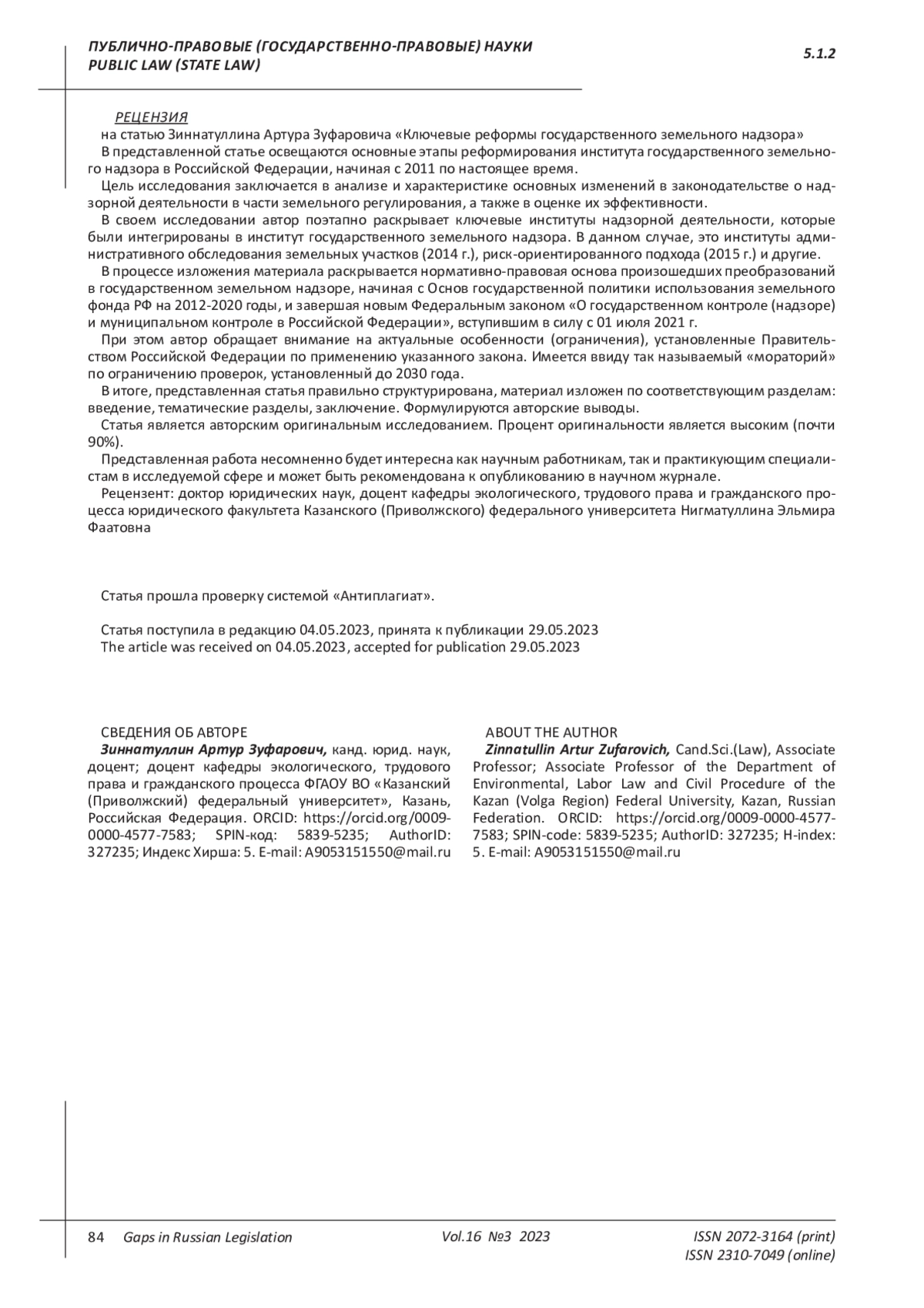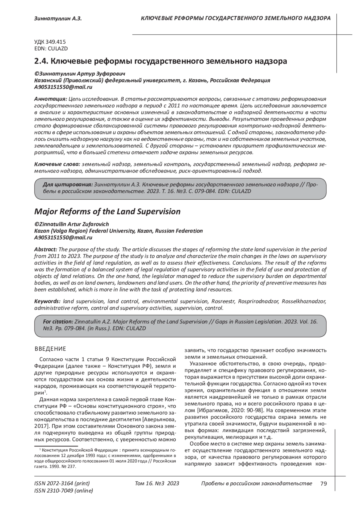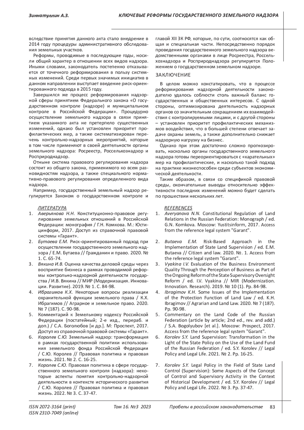 Korolev S.Y. Land Supervision: Transformation in the Light of the State Policy on the Use of the Land Fund of the Russian Federation / ed. S.Y. Korolev // Legal Policy and Legal Life. 2021. № 2. Pp. 16-25. EDN: AUTODP
