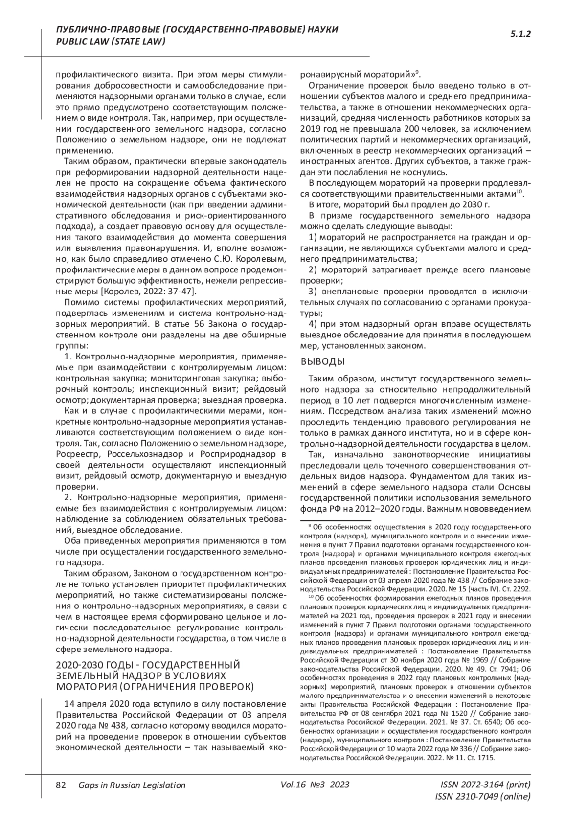 7. Королев С.Ю. Правовая политика в сфере государственного земельного контроля (надзора): некоторые аспекты понятия контрольно-надзорной деятельности в контексте исторического развития / С.Ю. Королев // Правовая политика и правовая жизнь. 2022. № 3. С. 37-47. EDN: WRSASK