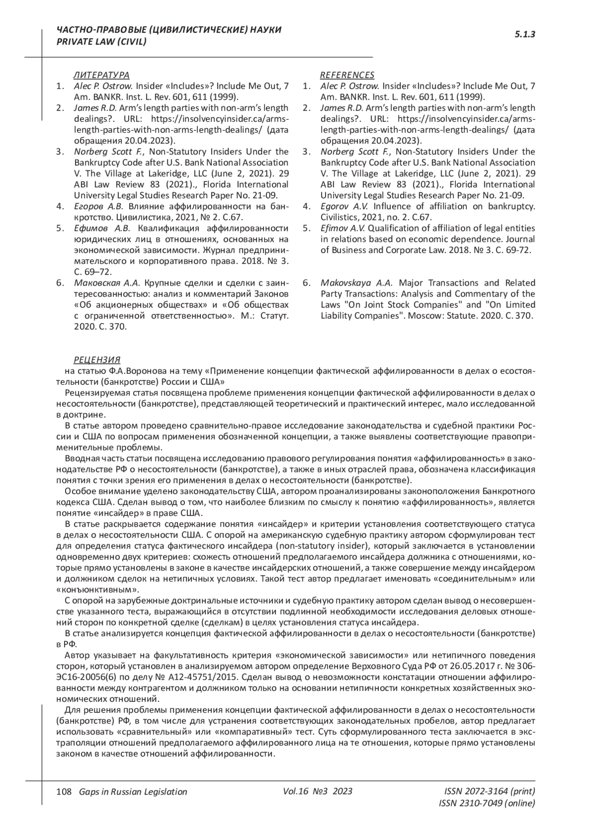 4. Егоров А.В. Влияние аффилированности на банкротство. Цивилистика, 2021, № 2. С.67. EDN: NUIIPY
