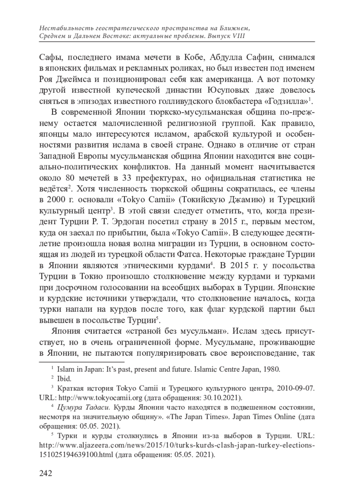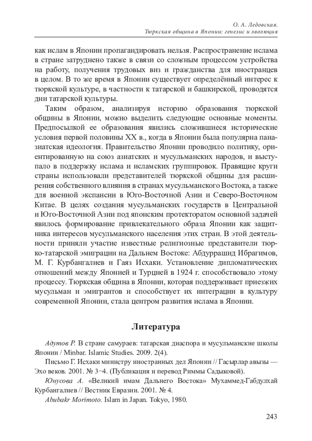 ЛЕДОВСКАЯ О. А. ТЮРКСКАЯ ОБЩИНА В ЯПОНИИ: ГЕНЕЗИС И ЭВОЛЮЦИЯ // НЕСТАБИЛЬНОСТЬ ГЕОСТРАТЕГИЧЕСКОГО ПРОСТРАНСТВА НА БЛИЖНЕМ, СРЕДНЕМ И ДАЛЬНЕМ ВОСТОКЕ: АКТУАЛЬНЫЕ ПРОБЛЕМЫ. 2022. № 8
