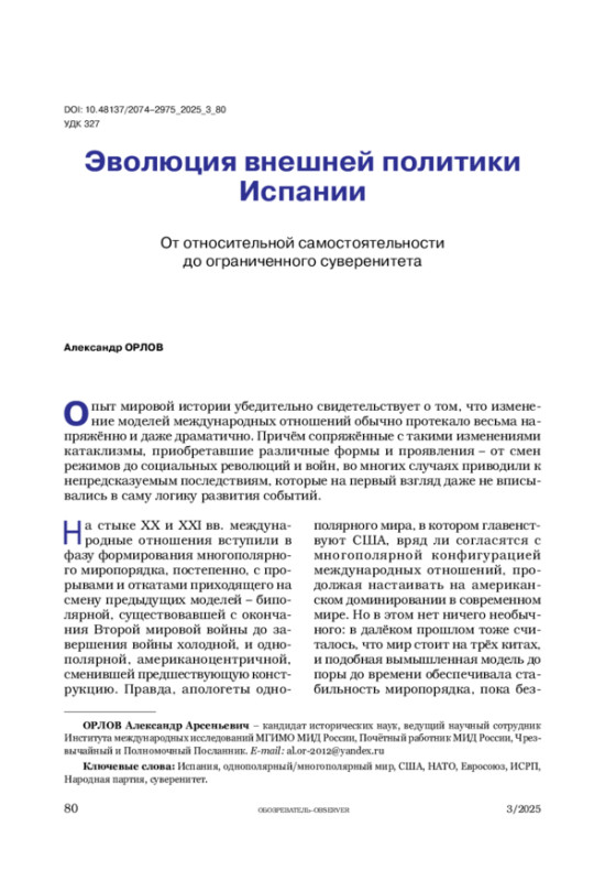 В последние десятилетия Испания, стремясь плыть в фарватере западного, американоцентричного мейнстрима, утратила значительную часть своей внешнеполитической идентичности. Мадрид долгие годы существовал в парадигме однополярного мира, основанного на неких правилах, отвергая концепцию многополярности, на которую ориентируется всё больше государств мира. Это привело к тому, что Испания, в отличие от прежних лет, не имеет собственной позиции по ключевым вопросам мировой политики.