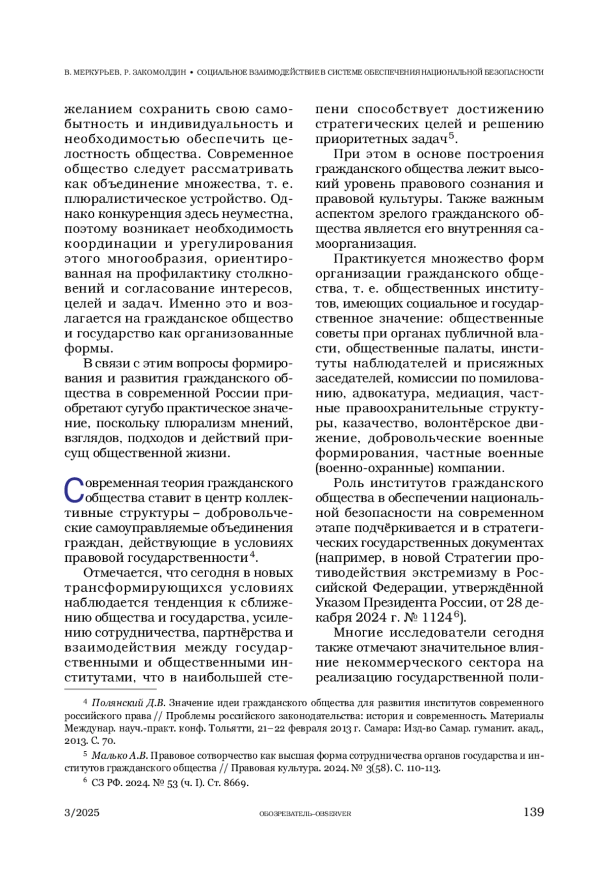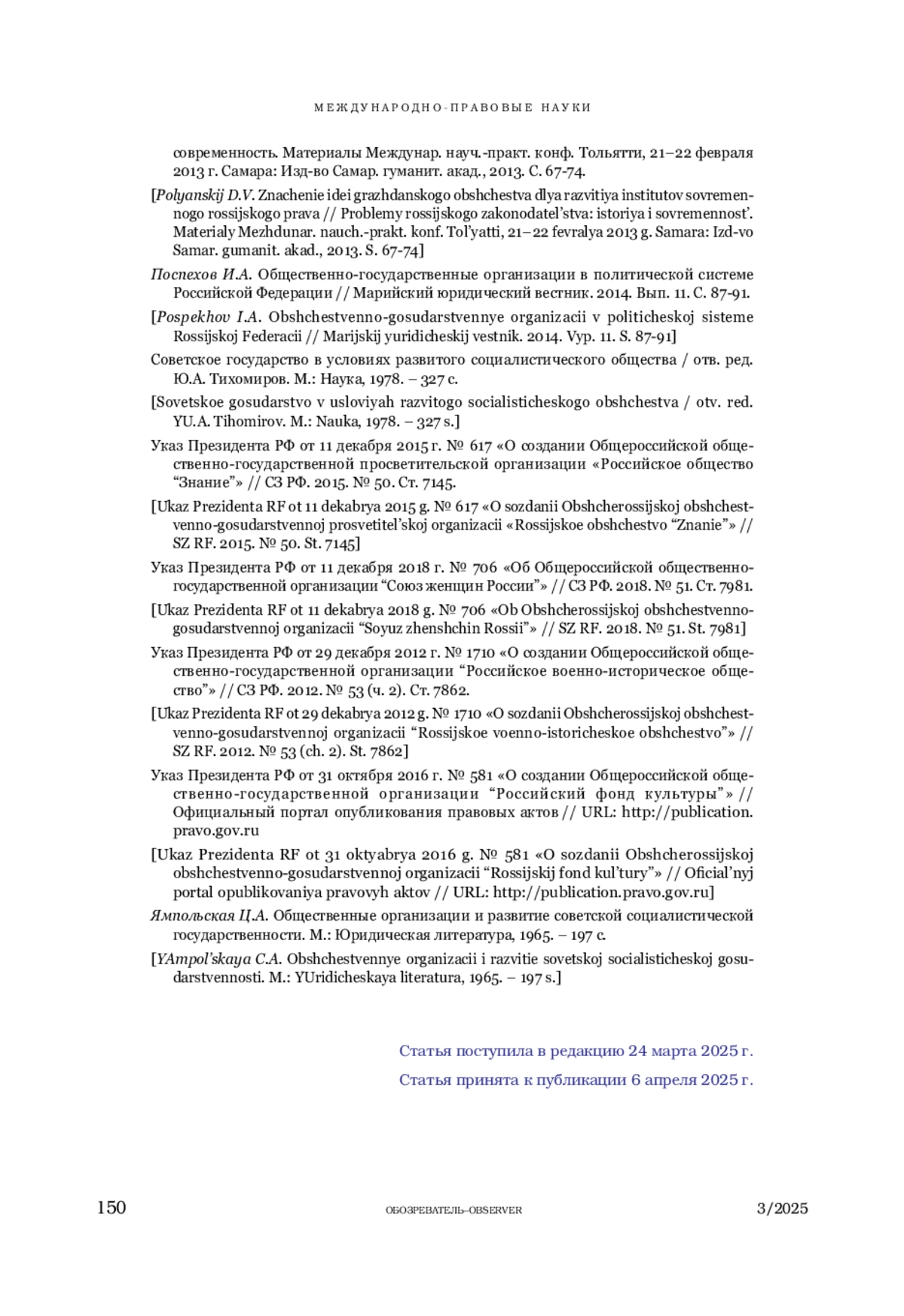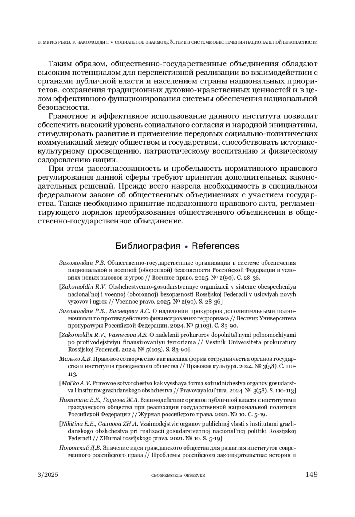 1. Закомолдин Р.В. Общественно-государственные организации в системе обеспечения национальной и военной (оборонной) безопасности Российской Федерации в условиях новых вызовов и угроз // Военное право. 2025. № 2(90). С. 28-36. [Zakomoldin R.V. Obshchestvenno-gosudarstvennye organizacii v sisteme obespecheniya nacional’noj i voennoj (oboronnoj) bezopasnosti Rossijskoj Federacii v usloviyah novyh vyzovov i ugroz // Voennoe pravo. 2025. № 2(90). S. 28-36]