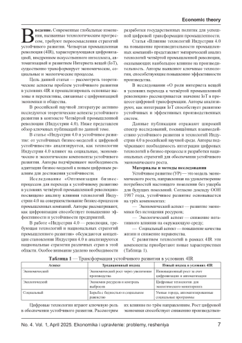 1. Иванов А. В., Петров Б. Н. Индустрия 4.0 и устойчивое развитие: от устойчивых бизнес- моделей к цифровой устойчивости // Экономика и управление. - 2023. - Т. 25, № 3. - С. 45-56. - URL: https://cyberleninka.ru/article/n/industriya-4-0-i-ustoychivoe-razvitie.