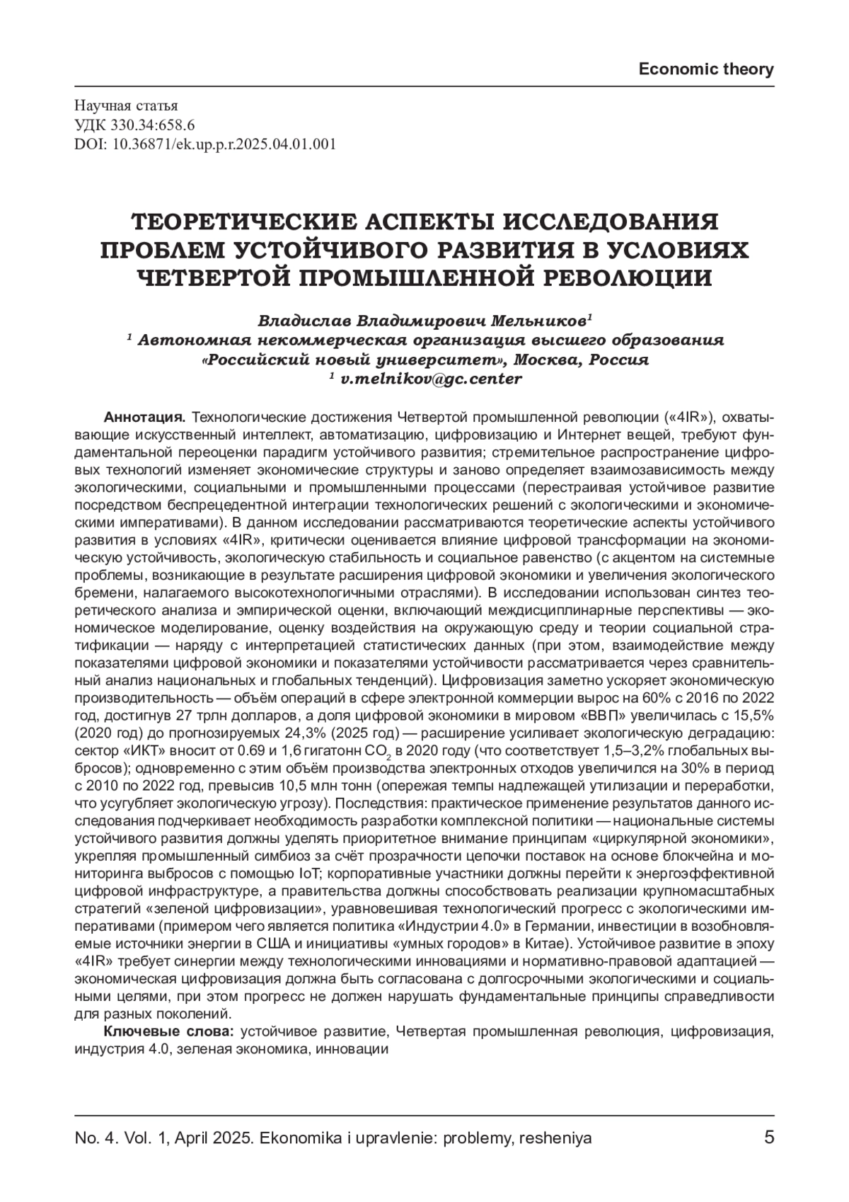 Технологические достижения Четвертой промышленной революции («4IR»), охватывающие искусственный интеллект, автоматизацию, цифровизацию и Интернет вещей, требуют фундаментальной переоценки парадигм устойчивого развития; стремительное распространение цифровых технологий изменяет экономические структуры и заново определяет взаимозависимость между экологическими, социальными и промышленными процессами (перестраивая устойчивое развитие посредством беспрецедентной интеграции технологических решений с экологическими и экономическими императивами). В данном исследовании рассматриваются теоретические аспекты устойчивого развития в условиях «4IR», критически оценивается влияние цифровой трансформации на экономическую устойчивость, экологическую стабильность и социальное равенство (с акцентом на системные проблемы, возникающие в результате расширения цифровой экономики и увеличения экологического бремени, налагаемого высокотехнологичными отраслями). В исследовании использован синтез теоретического анализа и эмпирической оценки, включающий междисциплинарные перспективы - экономическое моделирование, оценку воздействия на окружающую среду и теории социальной стратификации - наряду с интерпретацией статистических данных (при этом, взаимодействие между показателями цифровой экономики и показателями устойчивости рассматривается через сравнительный анализ национальных и глобальных тенденций). Цифровизация заметно ускоряет экономическую производительность - объём операций в сфере электронной коммерции вырос на 60% с 2016 по 2022 год, достигнув 27 трлн долларов, а доля цифровой экономики в мировом «ВВП» увеличилась с 15,5% (2020 год) до прогнозируемых 24,3% (2025 год) - расширение усиливает экологическую деградацию: сектор «ИКТ» вносит от 0.69 и 1,6 гигатонн CO2 в 2020 году (что соответствует 1,5-3,2% глобальных выбросов); одновременно с этим объём производства электронных отходов увеличился на 30% в период с 2010 по 2022 год, превысив 10,5 млн тонн (опережая темпы надлежащей утилизации и переработки, что усугубляет экологическую угрозу). Последствия: практическое применение результатов данного исследования подчеркивает необходимость разработки комплексной политики - национальные системы устойчивого развития должны уделять приоритетное внимание принципам «циркулярной экономики», укрепляя промышленный симбиоз за счёт прозрачности цепочки поставок на основе блокчейна и мониторинга выбросов с помощью IoT; корпоративные участники должны перейти к энергоэффективной цифровой инфраструктуре, а правительства должны способствовать реализации крупномасштабных стратегий «зеленой цифровизации», уравновешивая технологический прогресс с экологическими императивами (примером чего является политика «Индустрии 4.0» в Германии, инвестиции в возобновляемые источники энергии в США и инициативы «умных городов» в Китае). Устойчивое развитие в эпоху «4IR» требует синергии между технологическими инновациями и нормативно- правовой адаптацией - экономическая цифровизация должна быть согласована с долгосрочными экологическими и социальными целями, при этом прогресс не должен нарушать фундаментальные принципы справедливости для разных поколений.
