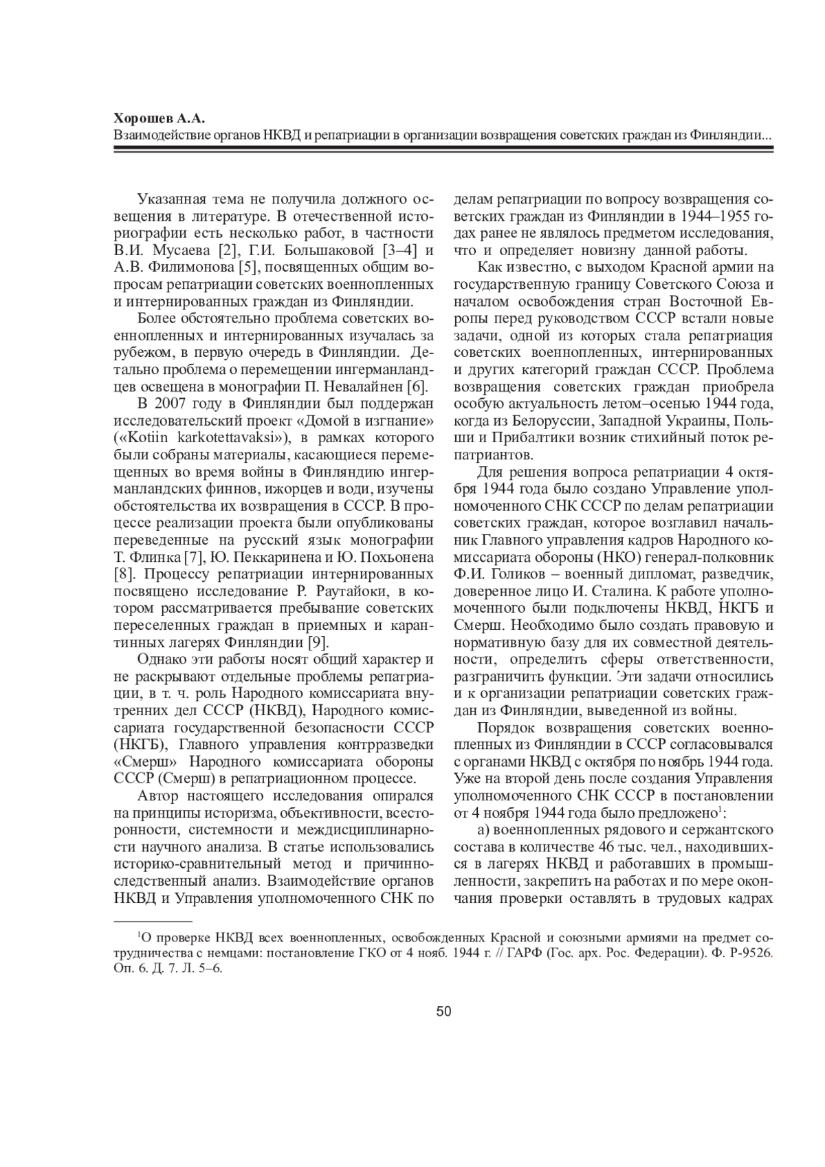 1. Kauppala P. Sent, Returned, and Repatriated from Finland to the Soviet Union: The Logic, Tragedy and the Humanity of Fate // Prisoners of War Deaths and People Handed over to Germany and the Soviet Union in 1939-55. A Research Report by the Finnish National Archives / ed. by L. Westerlund. Helsinki: Kansallisarkisto, 2008. P. 212-237.