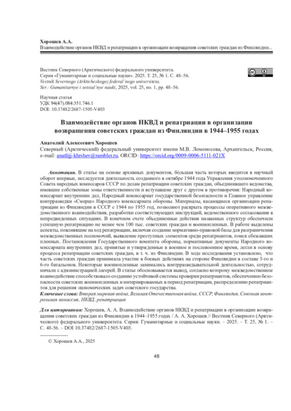 В статье на основе архивных документов, бóльшая часть которых вводится в научный оборот впервые, исследуется деятельность созданного в октябре 1944 года Управления уполномоченного Совета народных комиссаров СССР по делам репатриации советских граждан, объединившего ведомства, имевшие собственные зоны ответственности и вступавшие друг с другом в противоречия: Народный комиссариат внутренних дел, Народный комиссариат государственной безопасности и Главное управление контрразведки «Смерш» Народного комиссариата обороны. Материалы, касающиеся организации репатриации из Финляндии в СССР с 1944 по 1955 год, позволяют раскрыть процессы оперативного межведомственного взаимодействия, разработки соответствующих инструкций, ведомственного согласования в непредвиденных ситуациях. В конечном счете объединенные действия названных структур обеспечили успешную репатриацию не менее чем 100 тыс. советских граждан и военнопленных. В работе выделены аспекты, повлиявшие на ход репатриации, включая создание нормативно-правовой базы для разграничения межведомственных полномочий, выявление преступных элементов среди репатриантов, поиск сбежавших пленных. Постановления Государственного комитета обороны, нормативные документы Народного комиссариата внутренних дел, принятые и утвержденные в военное и послевоенное время, легли в основу процесса репатриации советских граждан, в т. ч. из Финляндии. В ходе исследования установлено, что часть советских граждан принимала участие в боевых действиях на стороне Финляндии в составе 3-го и 6-го батальонов. Некоторые военнопленные занимались контрразведывательной деятельностью, сотрудничали с администрацией лагерей. В статье обосновывается вывод, согласно которому межведомственное взаимодействие способствовало созданию устойчивой системы проверки репатриантов, обеспечению безопасности советских военнопленных и интернированных в период репатриации, распределению репатриантов для решения экономических задач советского государства.