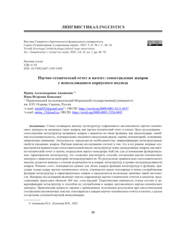 Статья посвящена анализу метаструктур современного англоязычного научно-технического дискурса на материале таких жанров, как научно-технический отчет и патент. Цель исследования - сопоставление метаструктур названных жанров с акцентом на такие функции, как диалогизация, линейная последовательность, подтверждение сказанного визуальным рядом, оценка, комментарий, толкование, привлечение внимания. Актуальность определяется необходимостью диверсификации метаструктурных свойств указанных жанров. Научная новизна исследования состоит в том, что в его рамках впервые осуществляется сравнительно-сопоставительный анализ метаструктур таких дискурсивных жанров, как научно-технический отчет и патент, посредством корпус-менеджера AntConc для установления функциональных характеристик метаструктур, что позволяет рассмотреть способы построения научно-технического дискурса с акцентом на категорию метадискурсивности. По результатам сравнительно-сопоставительного анализа делаются выводы о степени встречаемости в жанрах метаструктур и уровне метадискурсивности жанров. Помимо этого, описываются единые для обоих жанров функции метаструктур и функции, присущие только жанру научно-технического отчета, отмечаются самые популярные и менее употребляемые функции метаструктур в характеризуемых жанрах и предлагаются возможные причины такой частотности. Материал исследования включает тексты современных научно-технических отчетов и патентов, представленных корпусами объемом 360 тыс. слов каждый. Теоретическая значимость статьи состоит в диверсификации метаструктур и способов их употребления в жанрах англоязычного научно-технического дискурса. Практическая ценность связана с применением полученных результатов при самостоятельном составлении англоязычных текстов, относящихся к жанрам научно-технического отчета и патента, с целью построения успешной научной коммуникации.