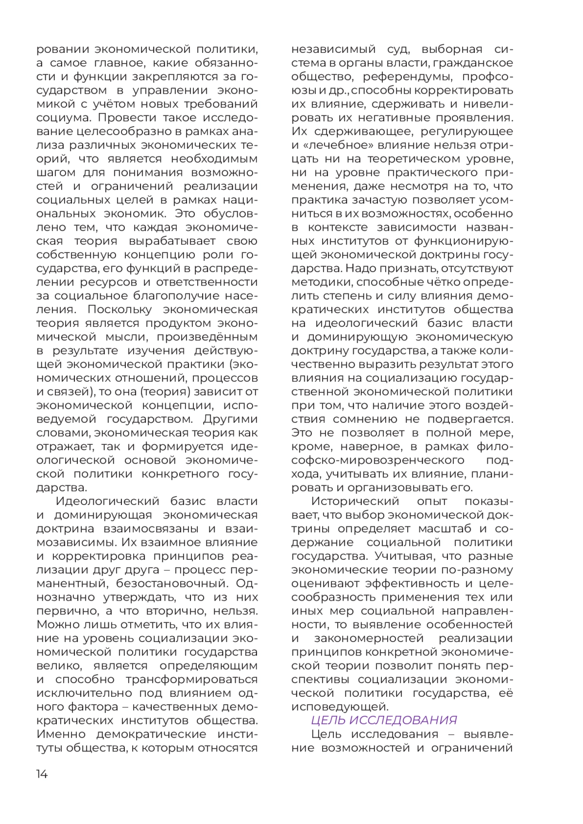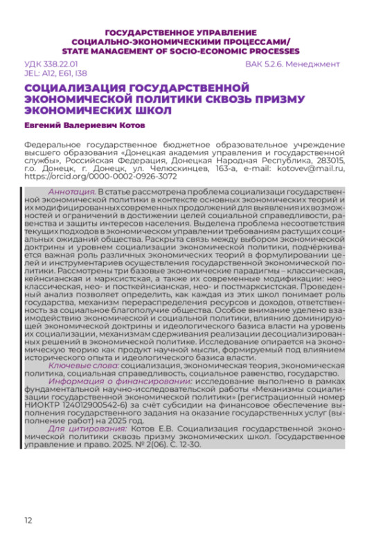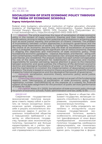 В статье рассмотрена проблема социализаци государственной экономической политики в контексте основных экономических теорий и их модифицированных современных продолжений для выявления их возможностей и ограничений в достижении целей социальной справедливости, равенства и защиты интересов населения. Выделена проблема несоответствия текущих подходов в экономическом управлении требованиям растущих социальных ожиданий общества. Раскрыта связь между выбором экономической доктрины и уровнем социализации экономической политики, подчёркивается важная роль различных экономических теорий в формулировании целей и инструментариев осуществления государственной экономической политики. Рассмотрены три базовые экономические парадигмы – классическая, кейнсианская и марксистская, а также их современные модификации: неоклассическая, нео- и посткейнсианская, нео- и постмарксистская. Проведенный анализ позволяет определить, как каждая из этих школ понимает роль государства, механизм перераспределения ресурсов и доходов, ответственность за социальное благополучие общества. Особое внимание уделено взаимодействию экономической и социальной политики, влиянию доминирующей экономической доктрины и идеологического базиса власти на уровень их социализации, механизмам сдерживания реализации десоциализированных решений в экономической политике. Исследование опирается на экономическую теорию как продукт научной мысли, формируемый под влиянием исторического опыта и идеологического базиса власти.